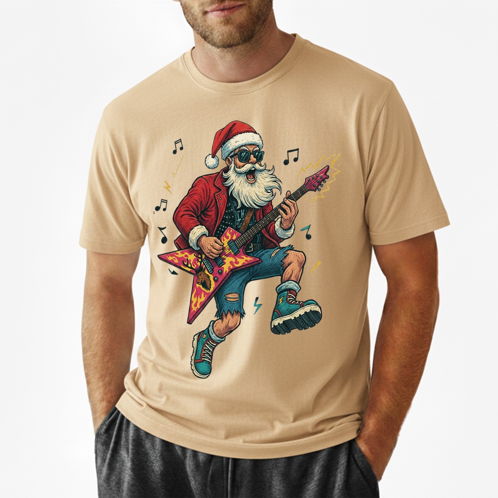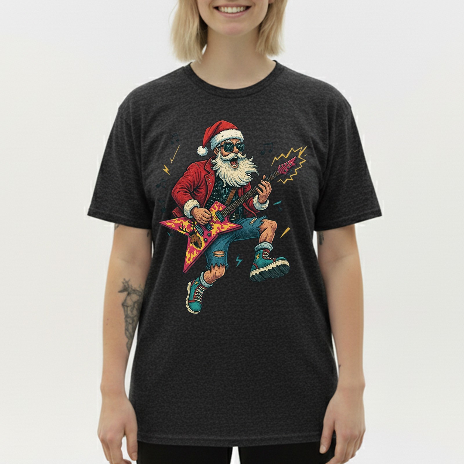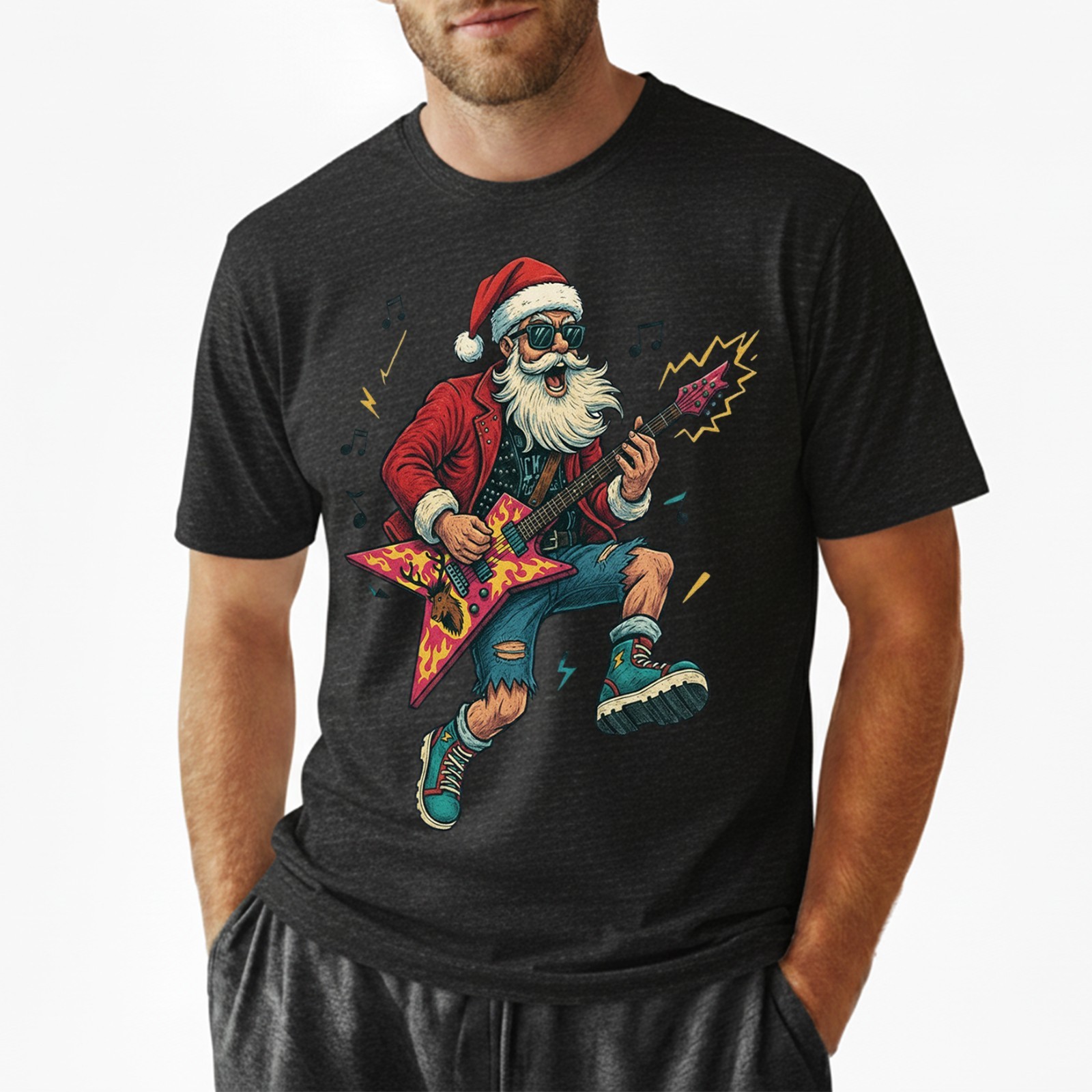 Heavy Metal Santa T-Shirt Funny Christmas Rock and Roll Guitar Graphic Tee S-5XL