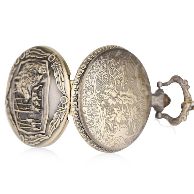 For Men Bronze Wild Wolf Pocket Watch With Necklace Chain Awesome Animal Gifts