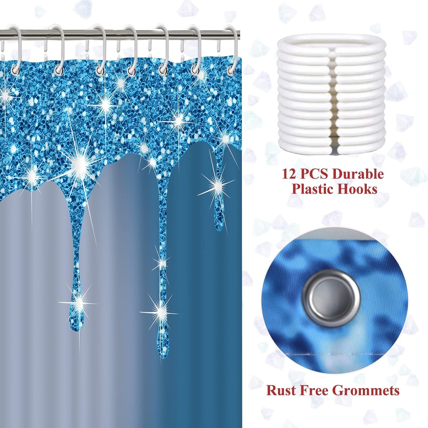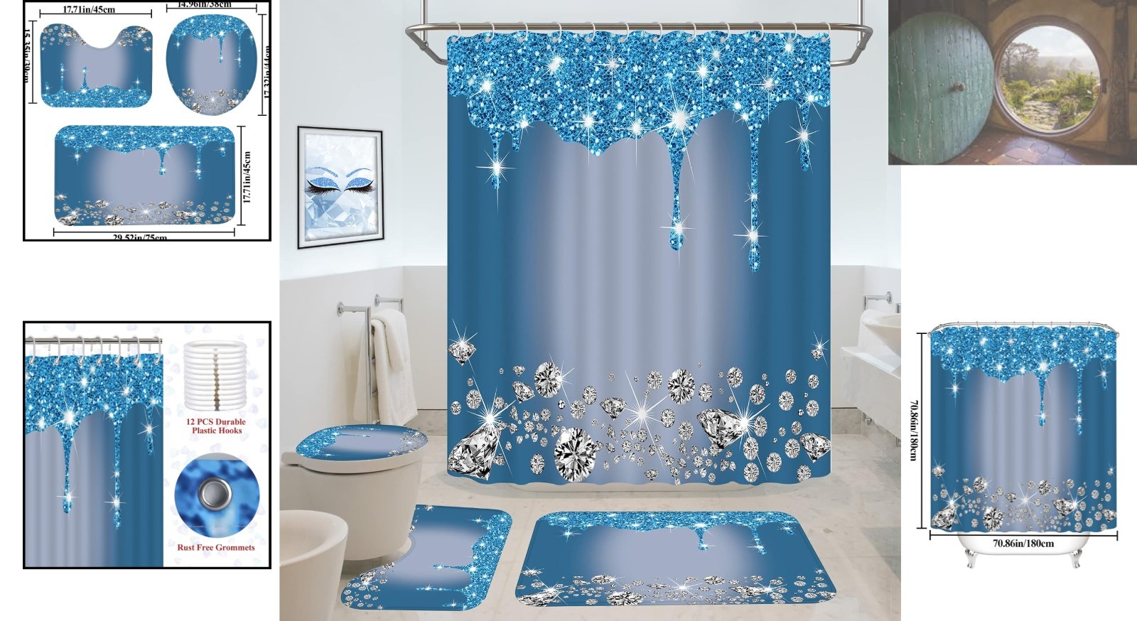4 Pcs Glitter Diamond Shower Curtain Set with Rugs - Luxurious Blue Texture 7...