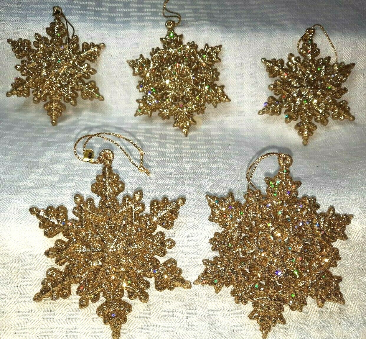 • Dazzling Snowflakes Ornaments -Glittery Gold 3D - Reflects colors Set of 5