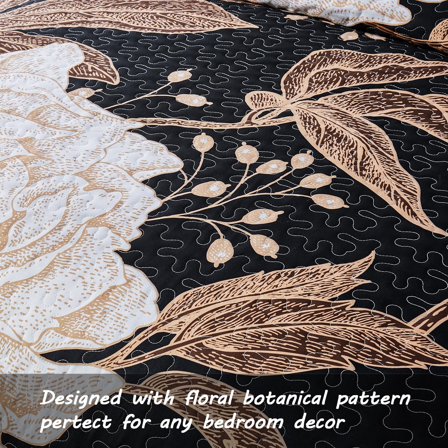 как выглядит Full Queen Size Quilt Set,White Gold Floral Botanical Pattern Black Bedding S... фото