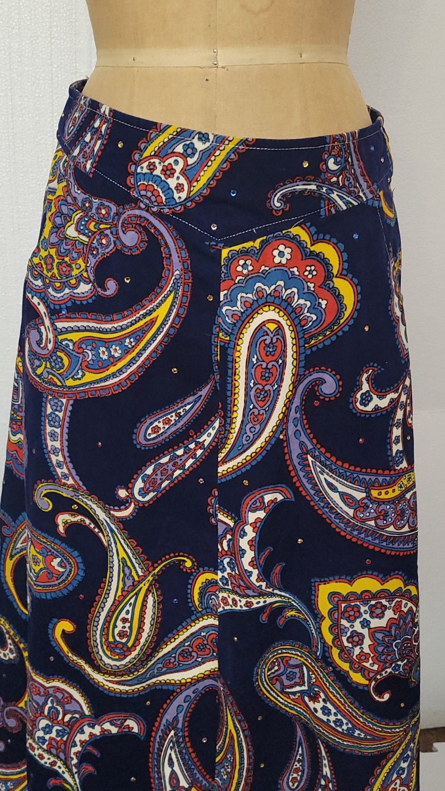 Vintage 70s Velveteen Maxi Skirt Psychedelic Paisley print and Rhinestone Med
