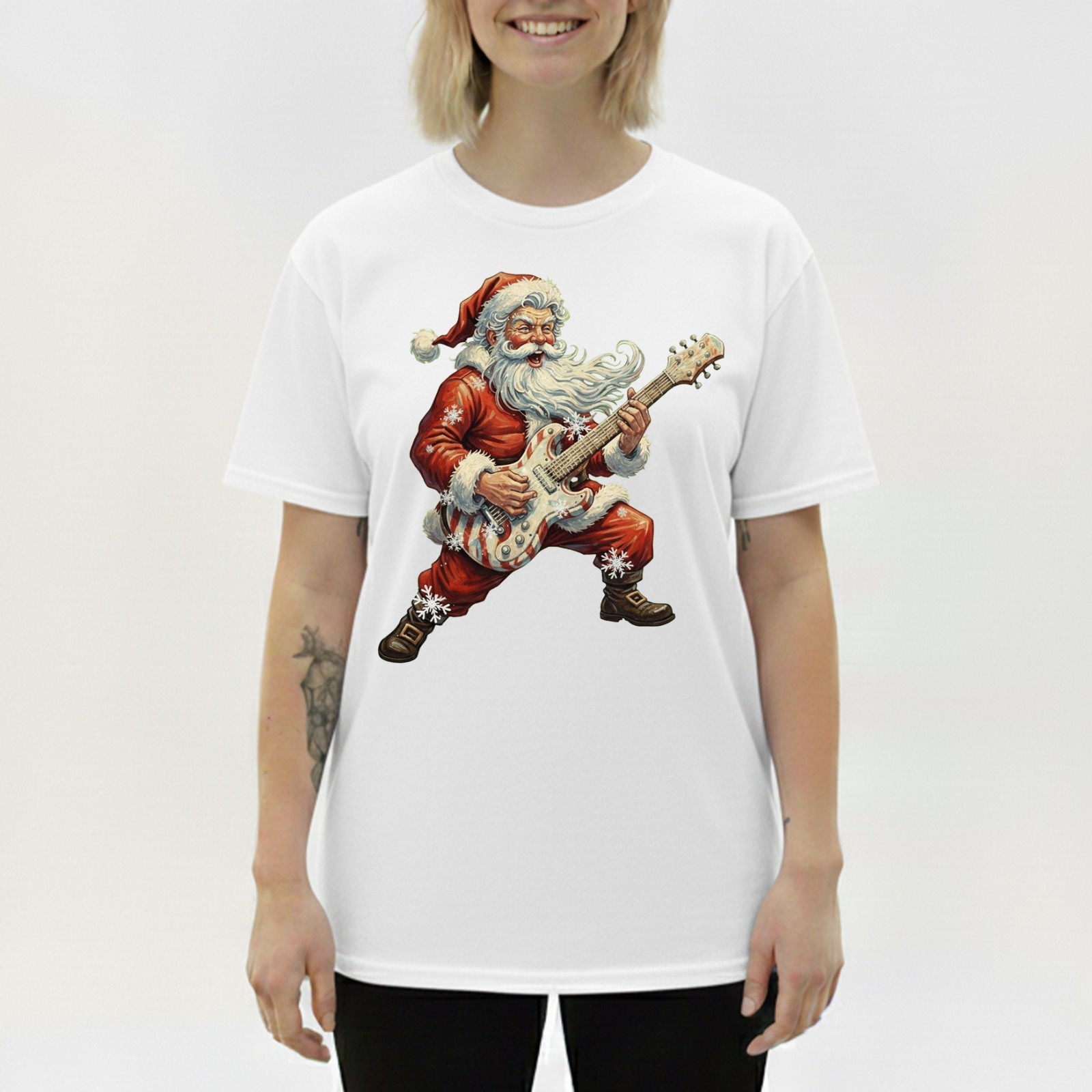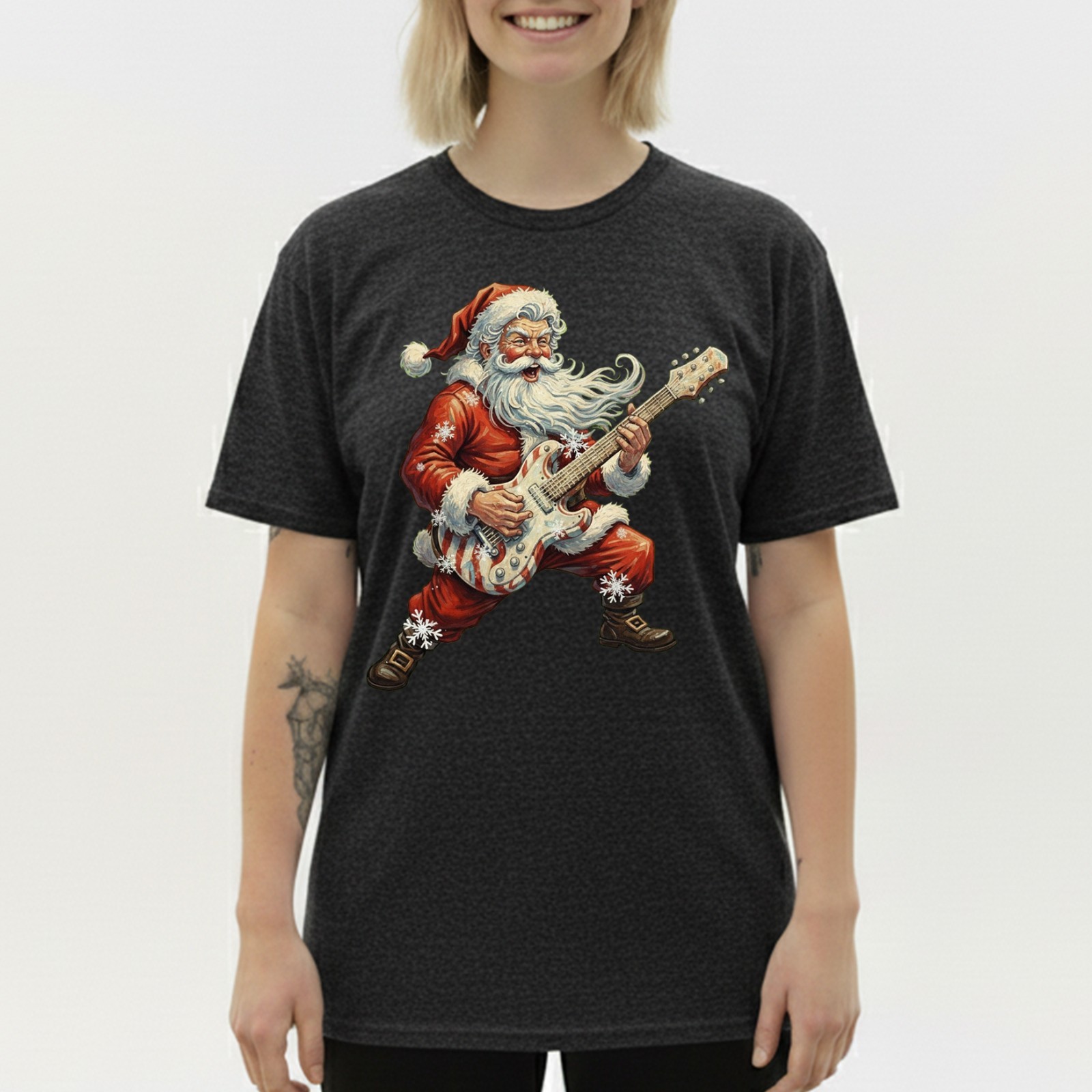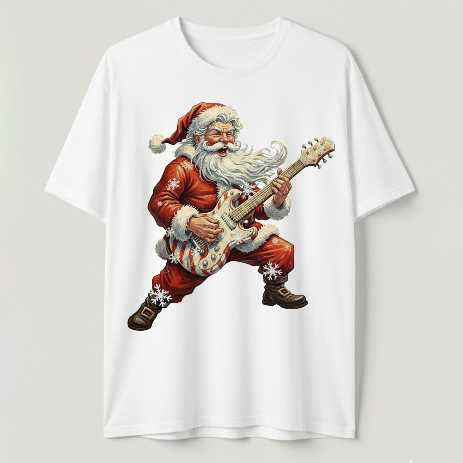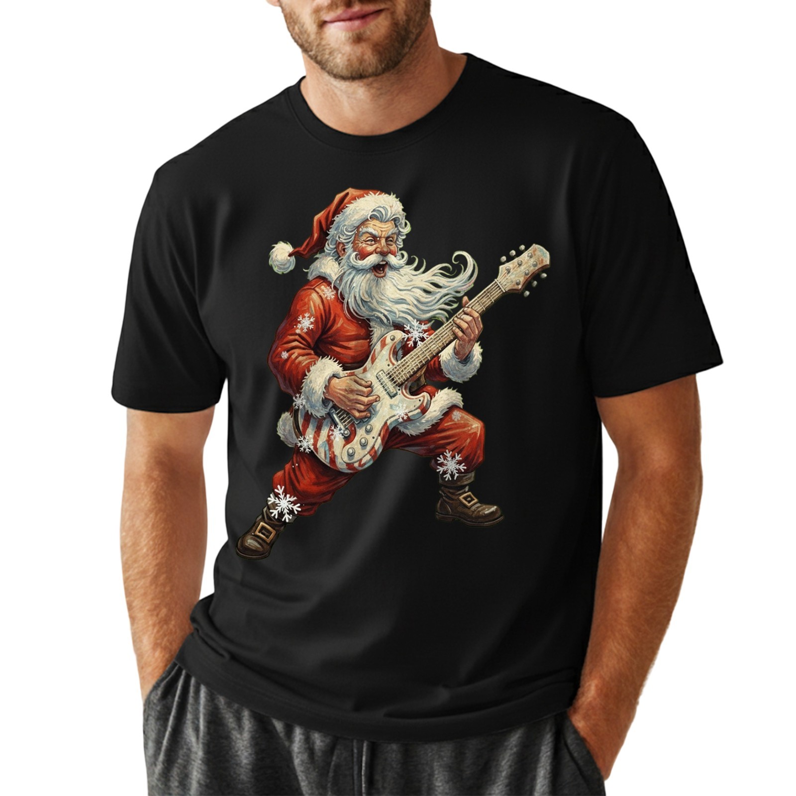 Rock and Roll Santa T-Shirt Christmas Electric Guitar Heavy Metal Xmas Tee S-5XL