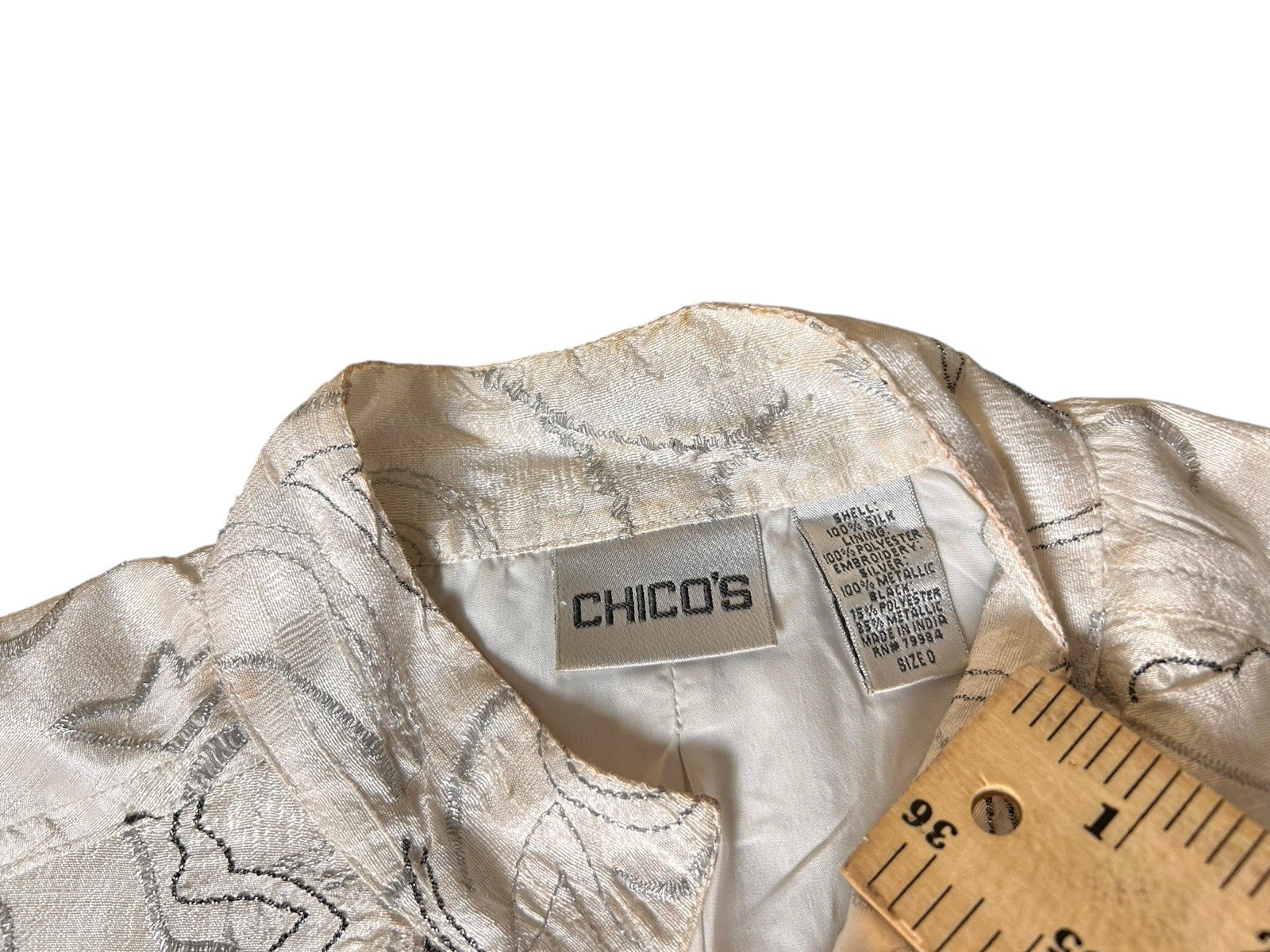 Chico s Embroidered Print Jacket Size 0 XS/Small Ivory Mandarin Collar READ