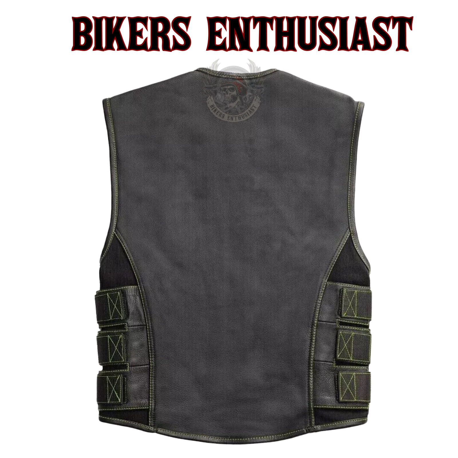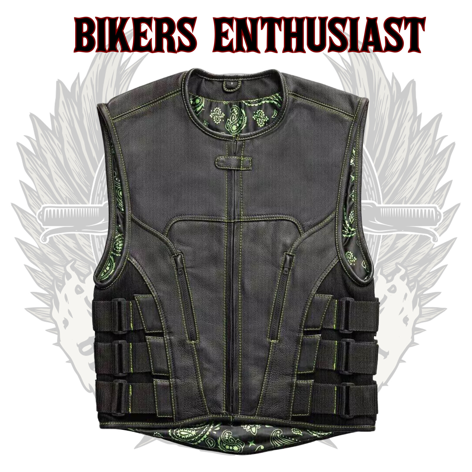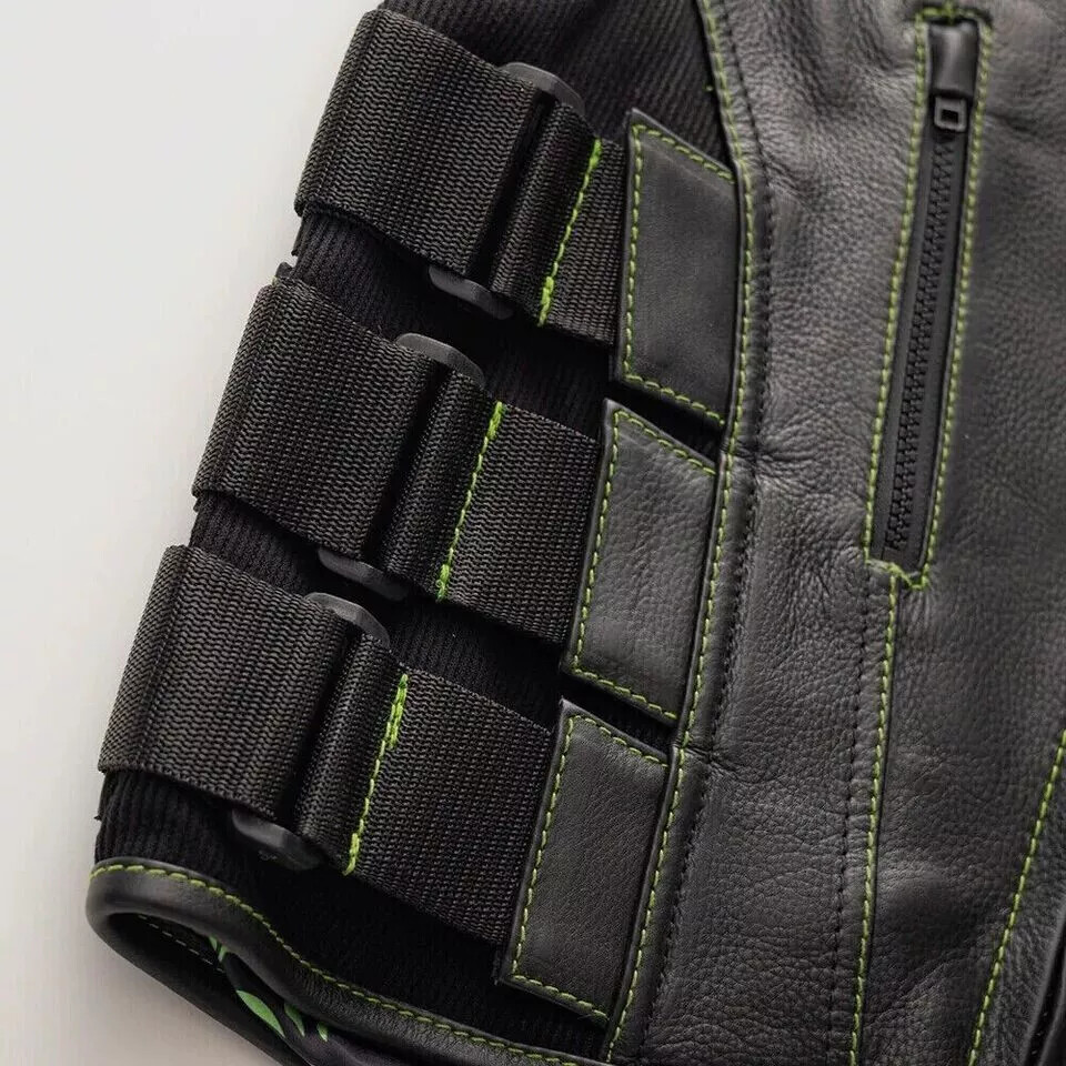 Black Leather Vest Men's Biker Swat Handmade Green Paisley Lining Waistcoat