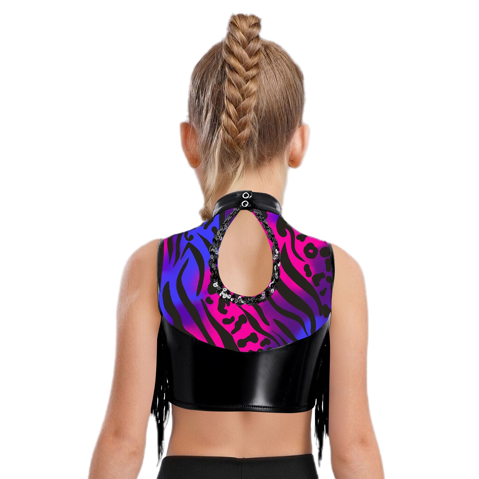 Girls Metallic Costume Jazz Gymnastics Hip Hop 2 Piece Fringed Crop Top Shorts
