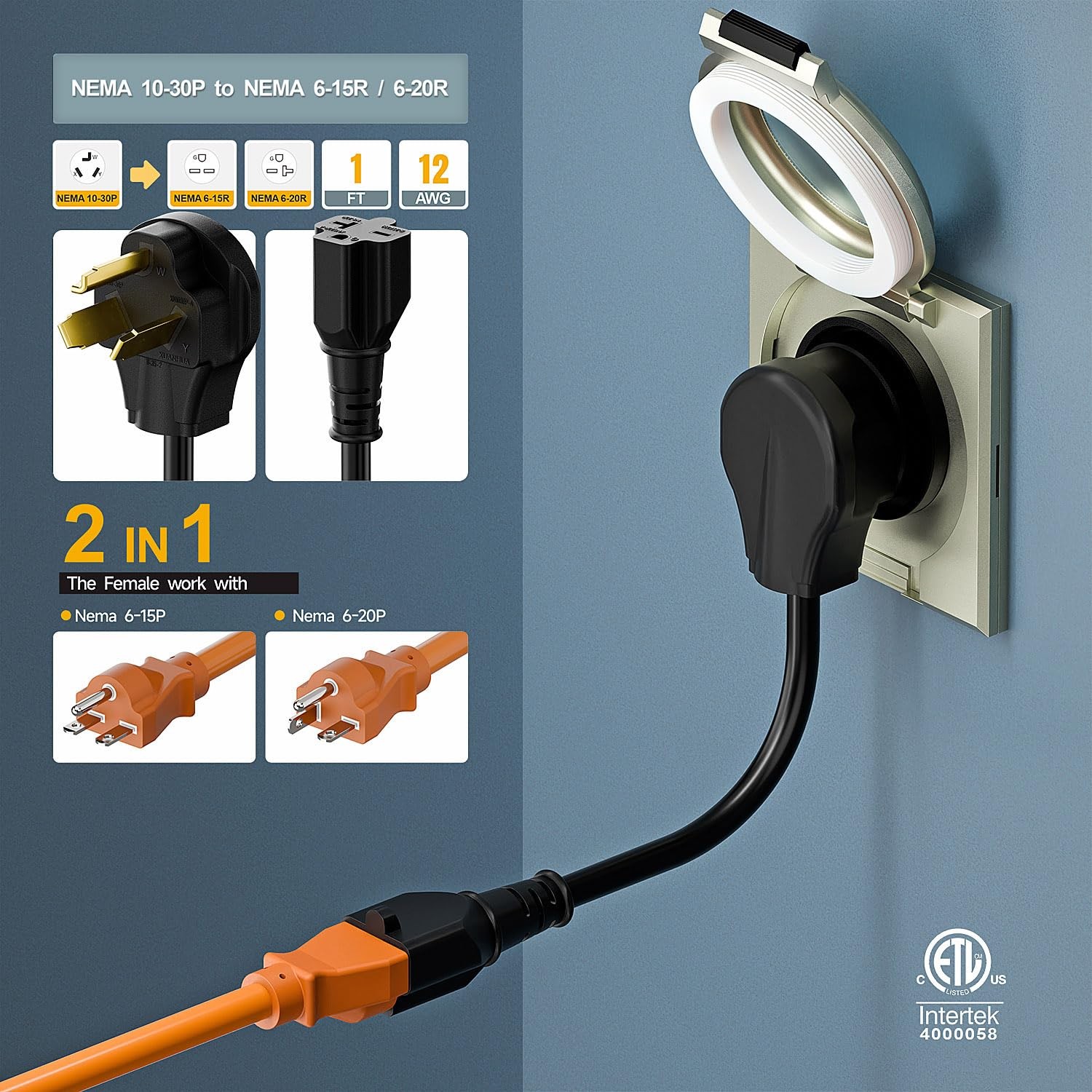 1FT Nema 10-30P 30Amp Dryer Plug Male to 6-20R T-Blade Female Adapter,30A 125...