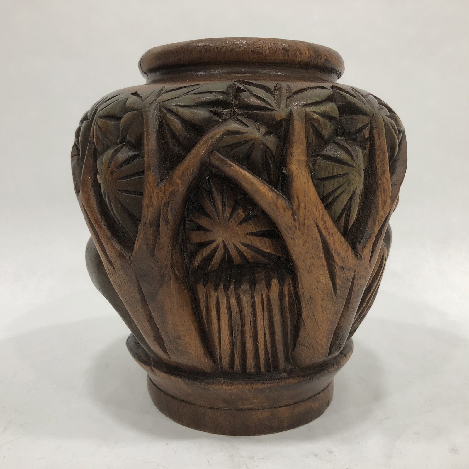Beautiful Hand Carved Wood Elephants Vase 5.5 x 6 Tall