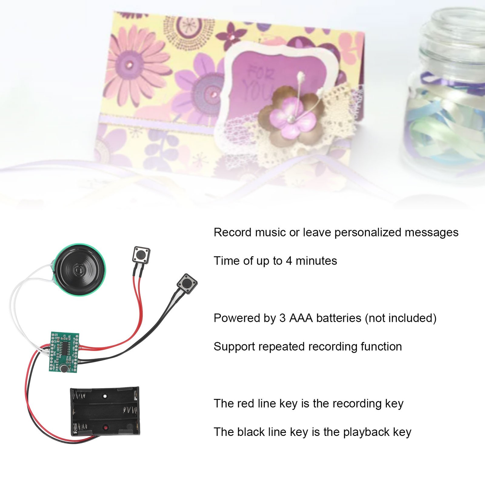 4 Minutes Voice Greeting Card Module 10cm Cable Key Control Looping Playback