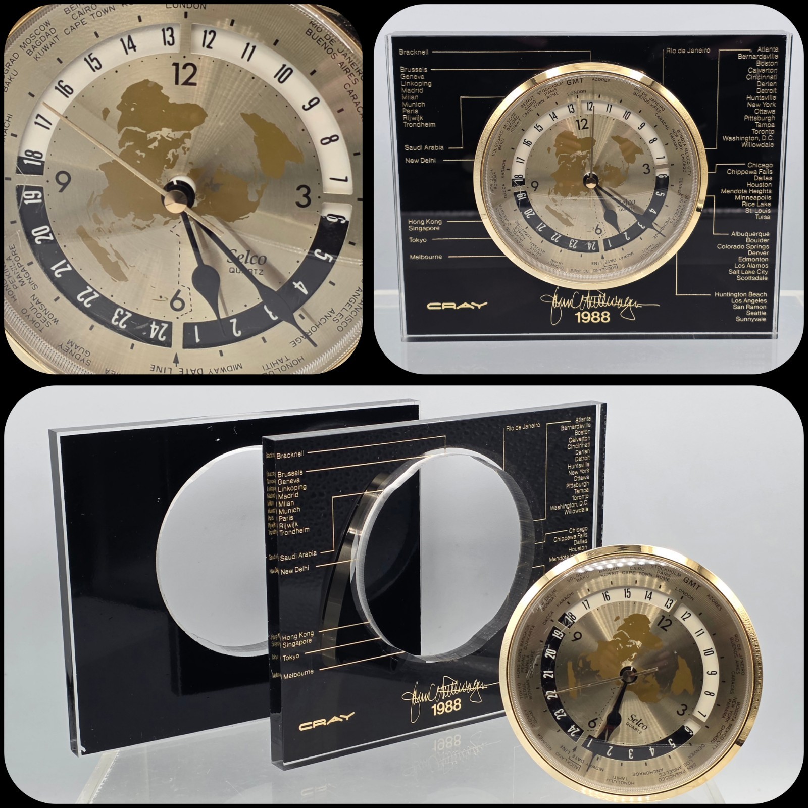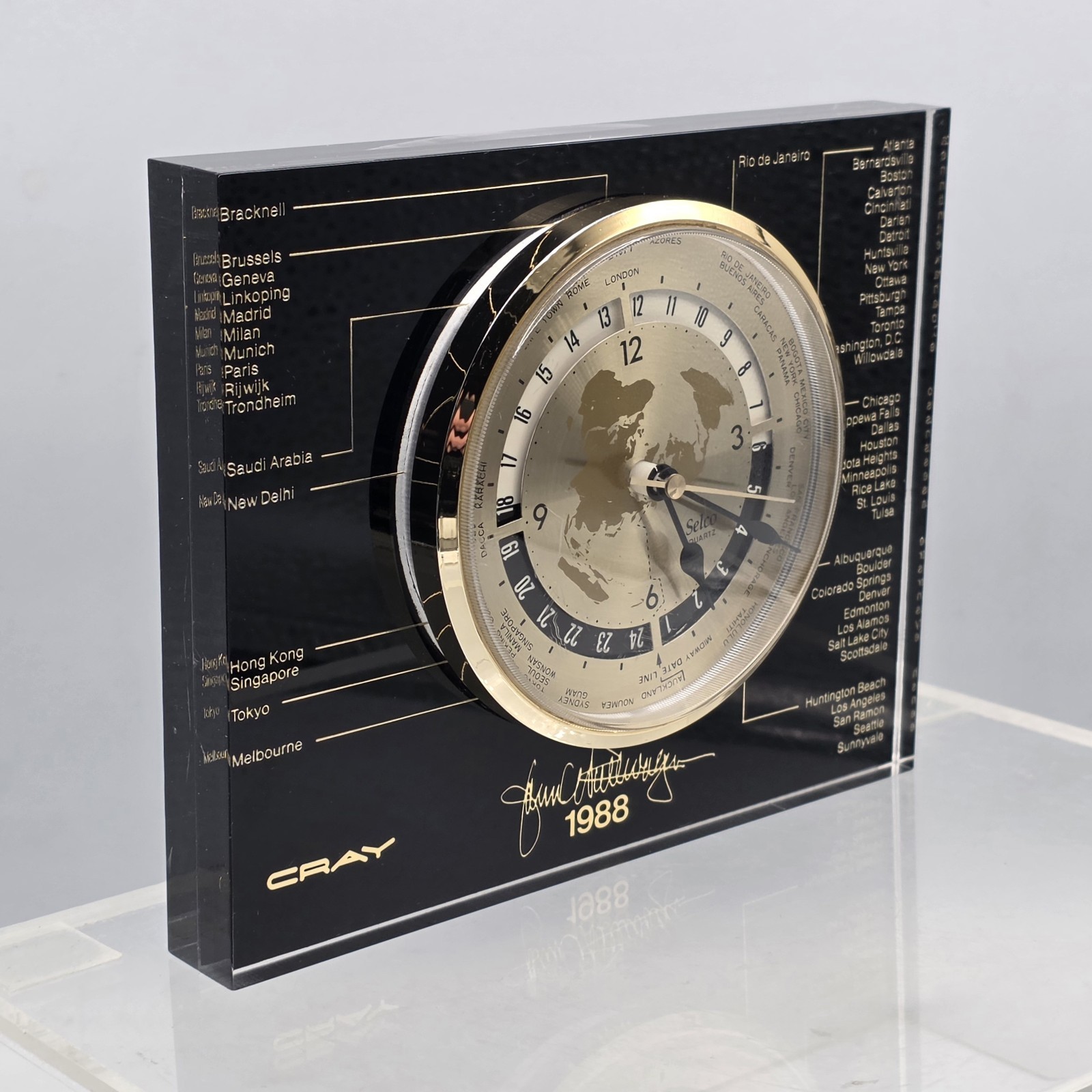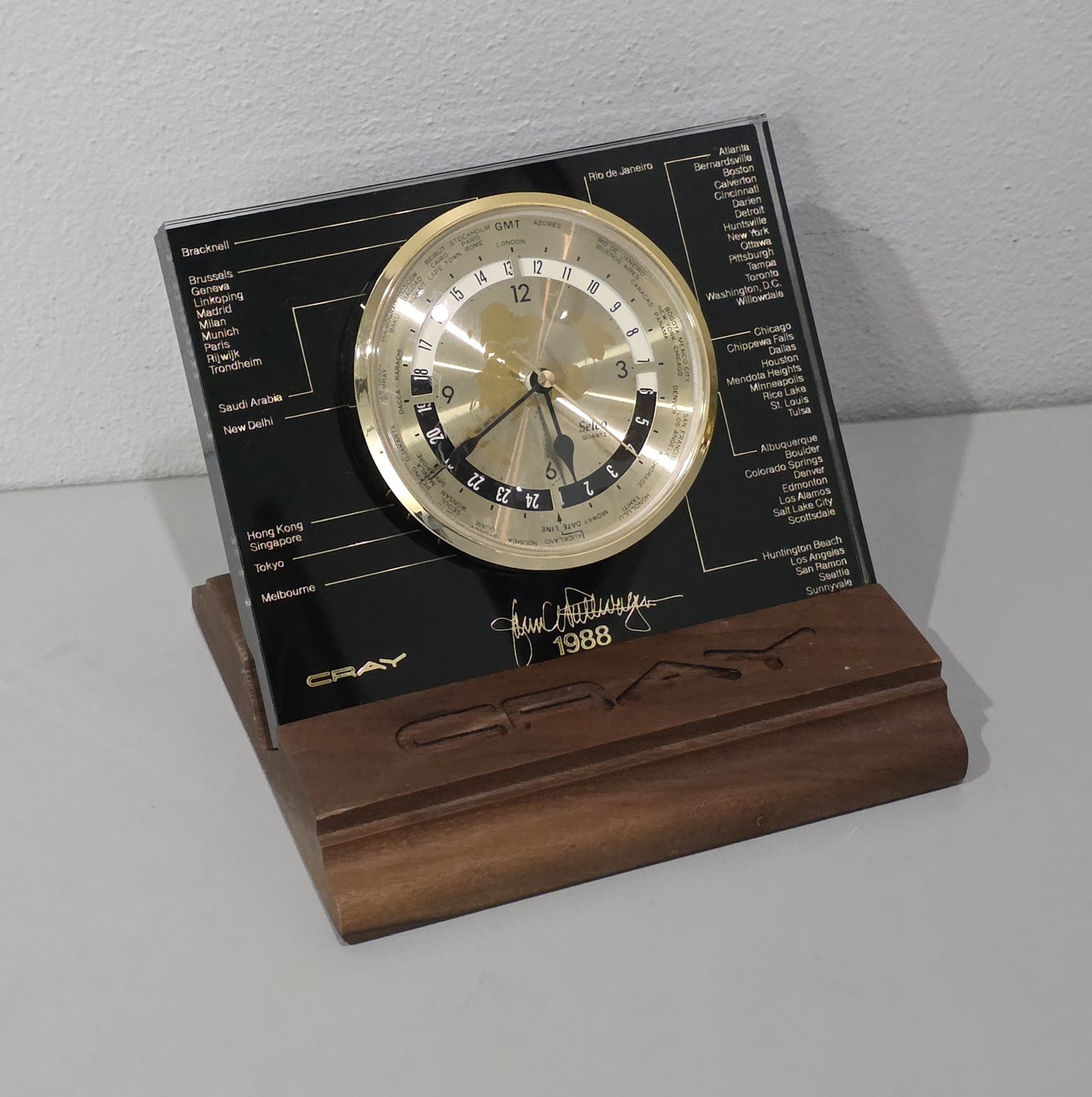 Cray Research Computers 1988 Selco Quartz World Time Clock TESTED WITH WOOD BASE