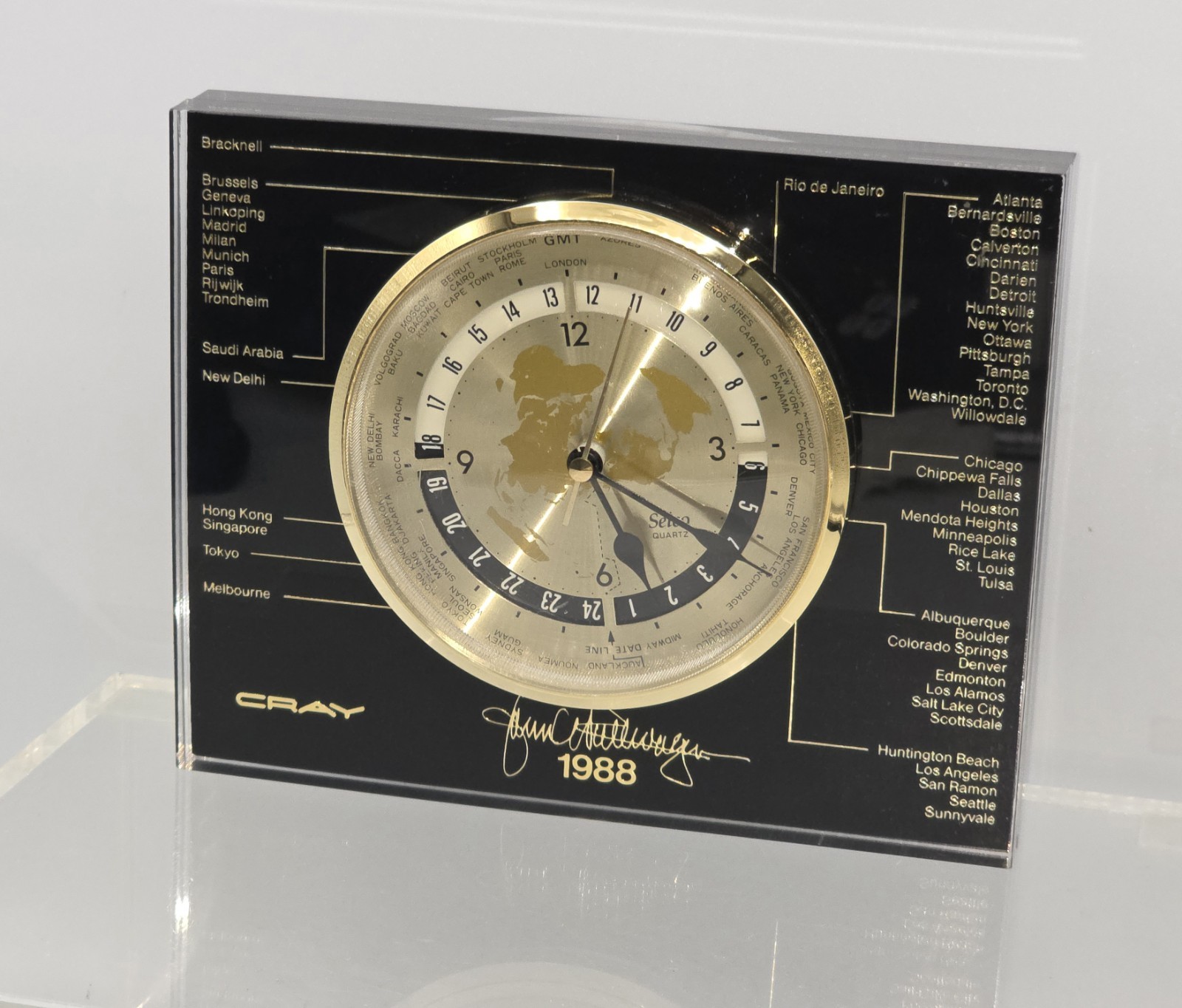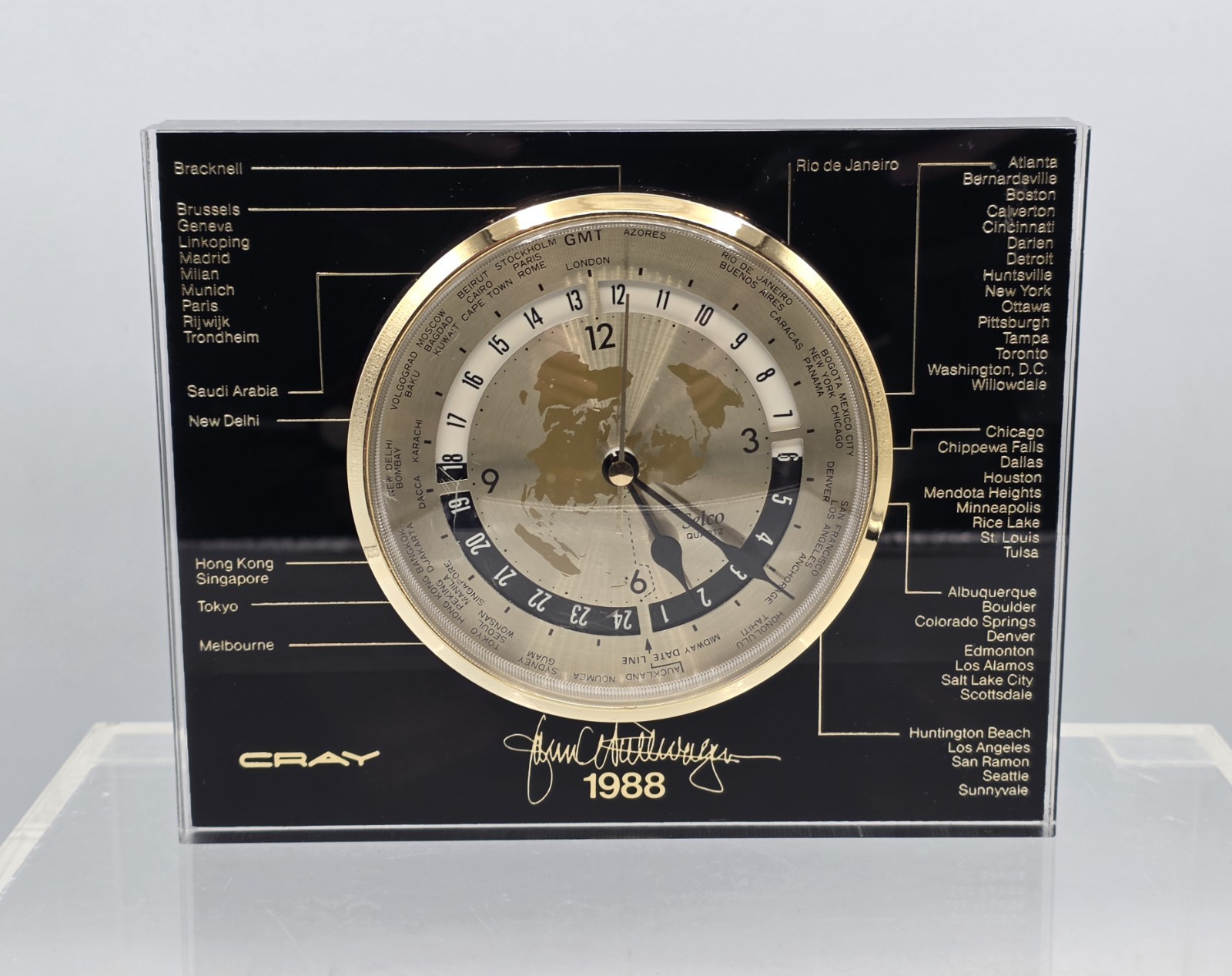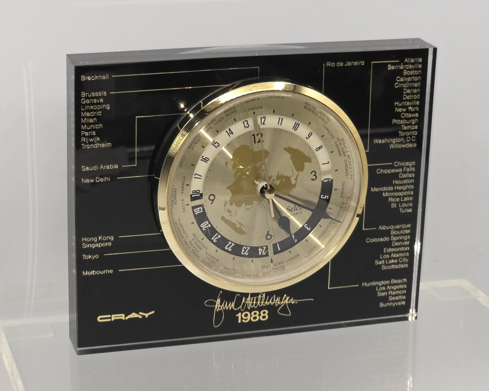 Cray Research Computers 1988 Selco Quartz World Time Clock TESTED WITH WOOD BASE
