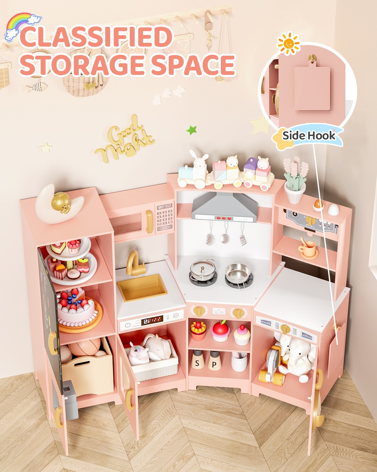 Kids Pretend Play Kitchen Wooden Toy Set with Sink/Faucet/Ice Maker/Range Hood