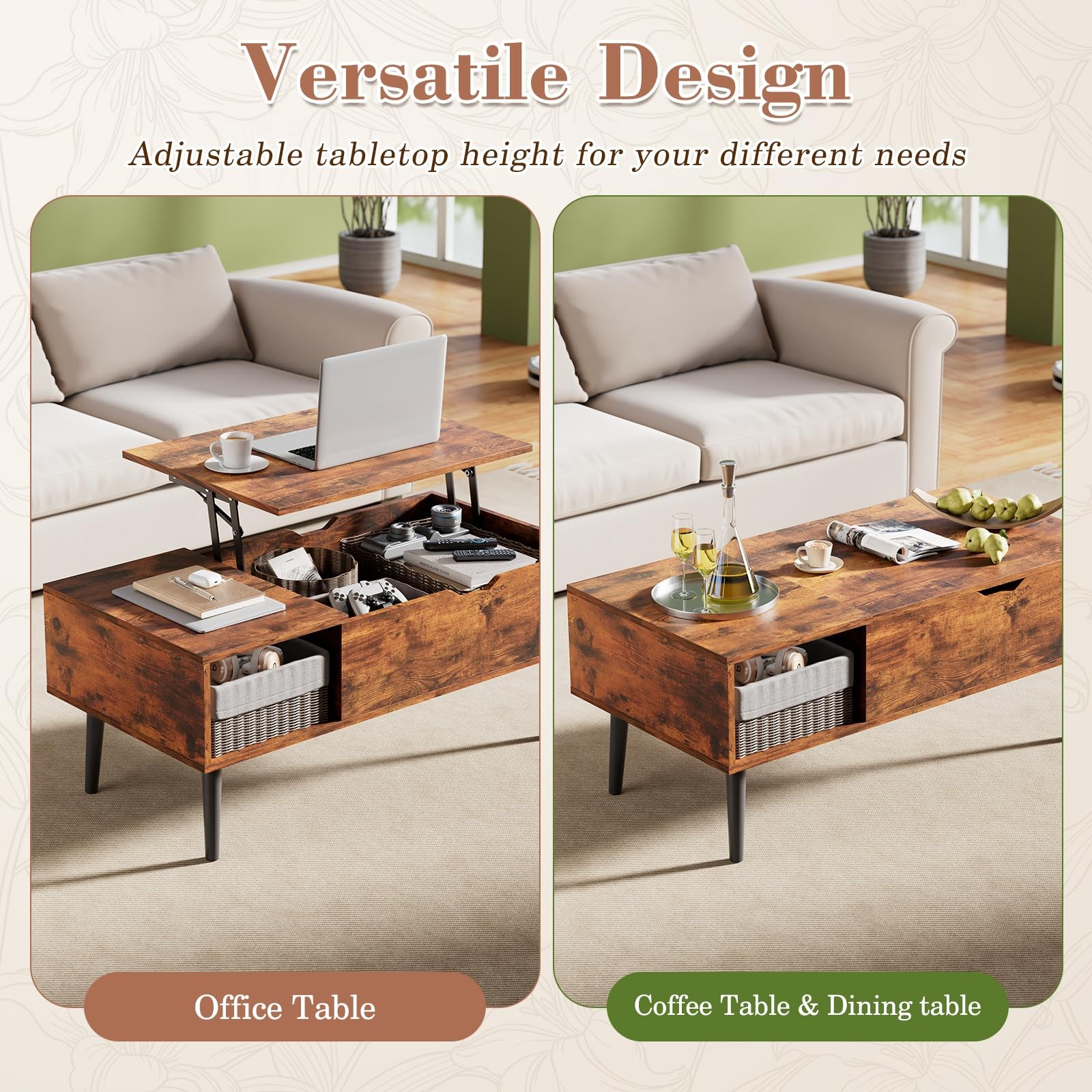 Wood Lift Top Coffee Table with Hidden Compartment and Large Storage Shelf, L...