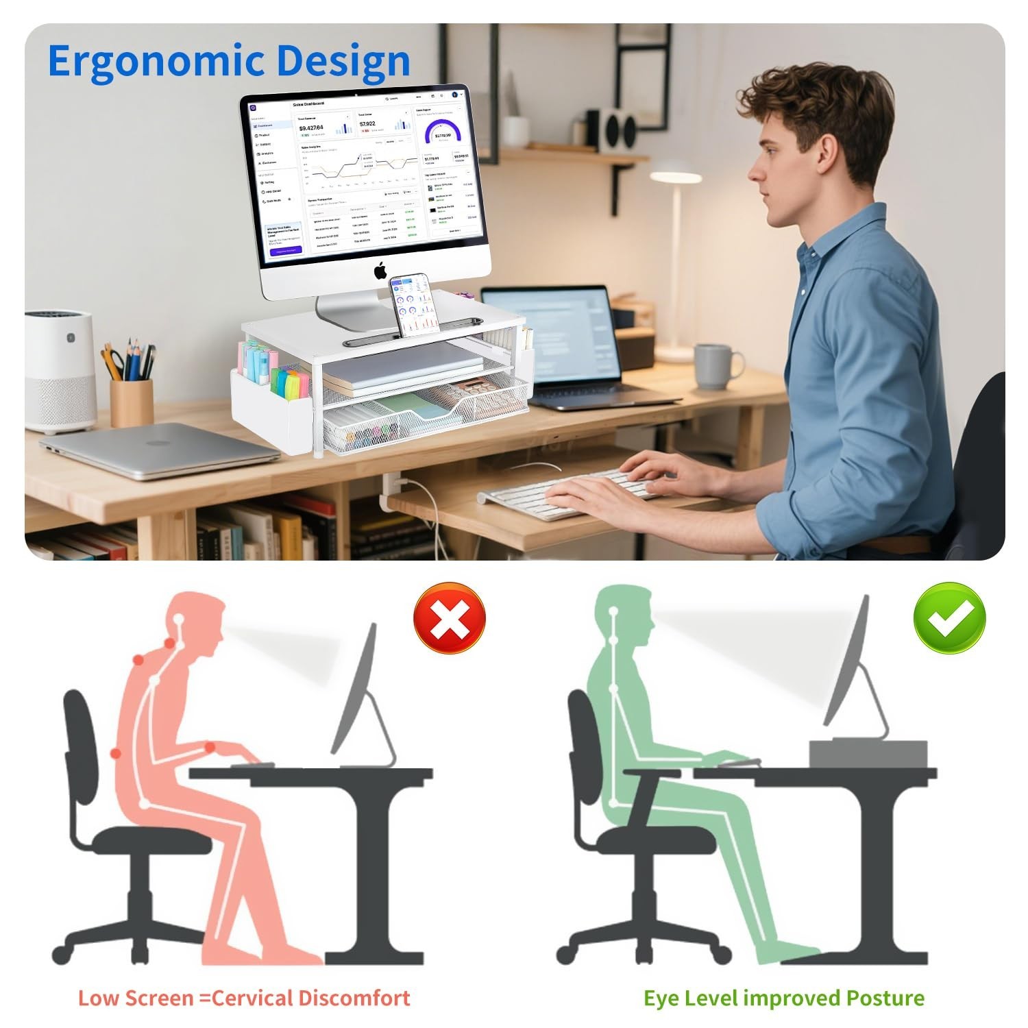 AUPSEN White Monitor Stand Riser, 2-Tier Wood Computer Desk Organizer with Dr...