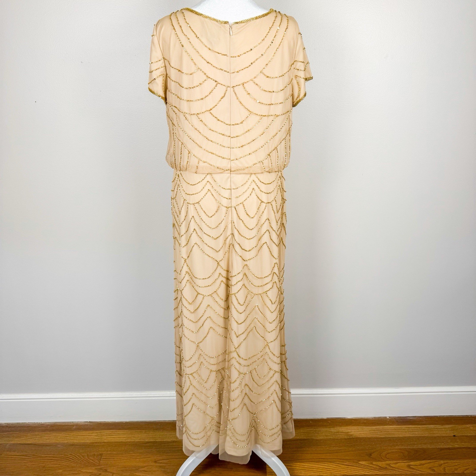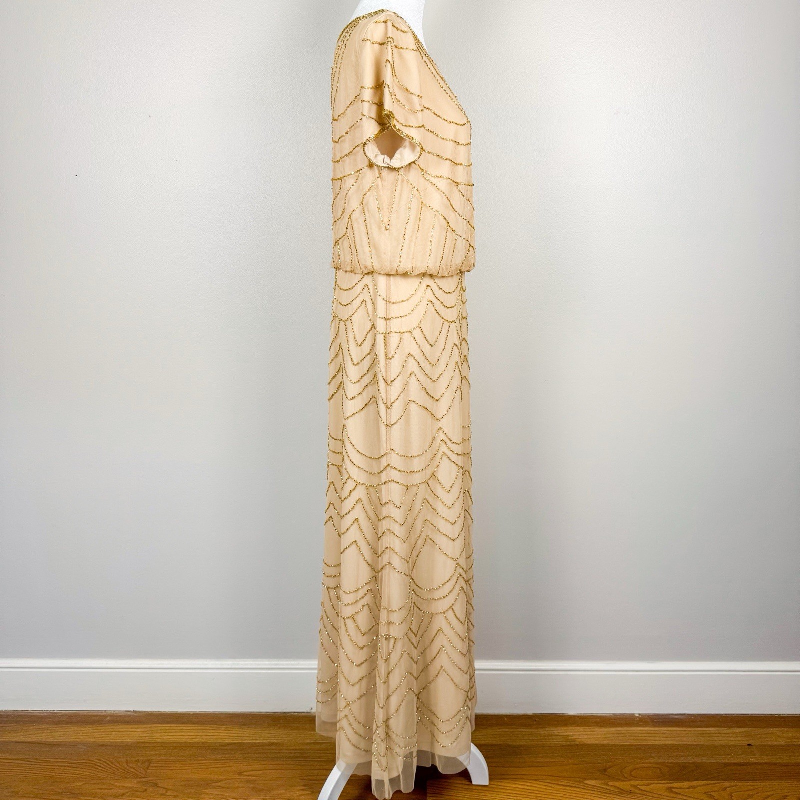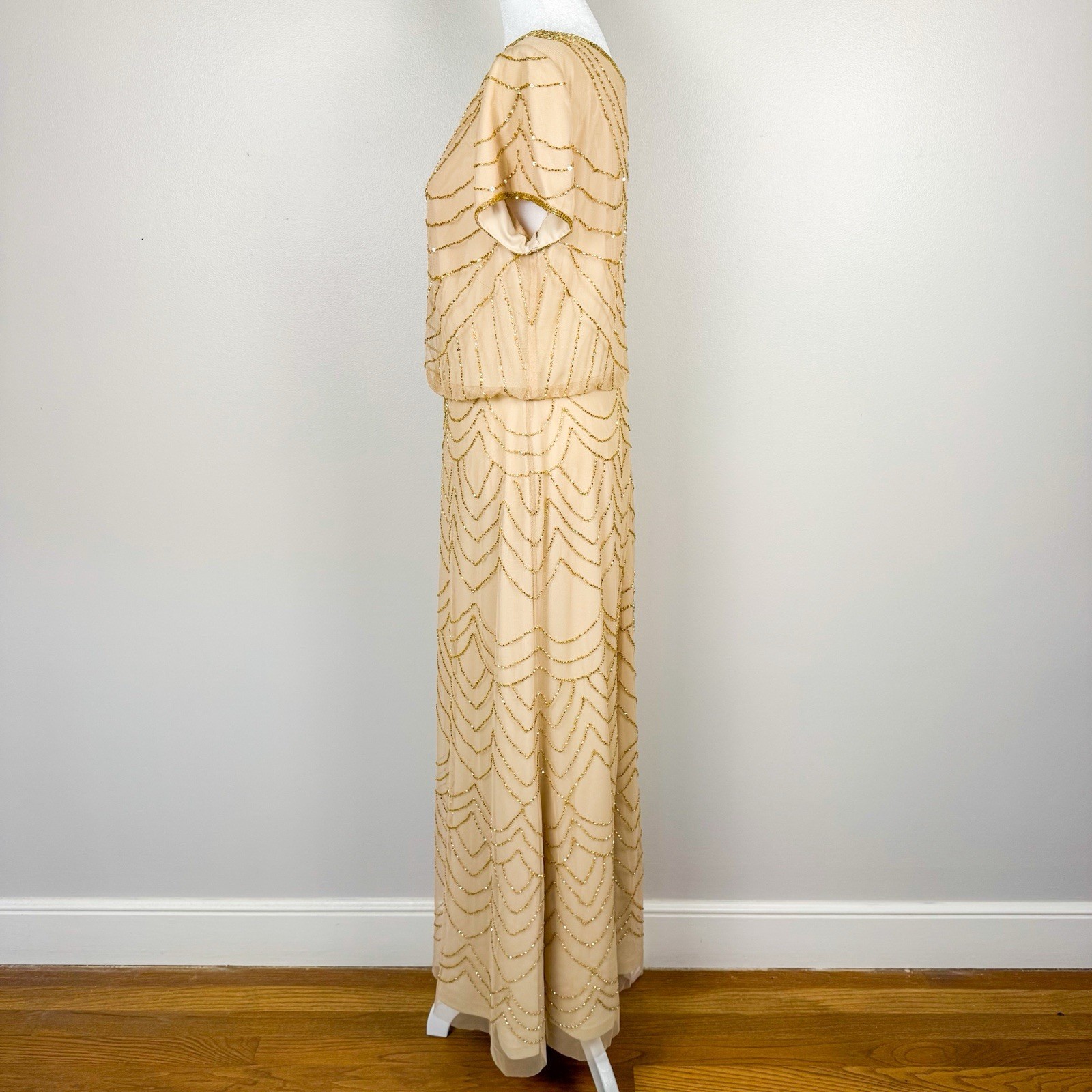 как выглядит Adrianna Papell Short Sleeve Art Deco Beaded Blouson Gown in Rose Gold Size 12 фото