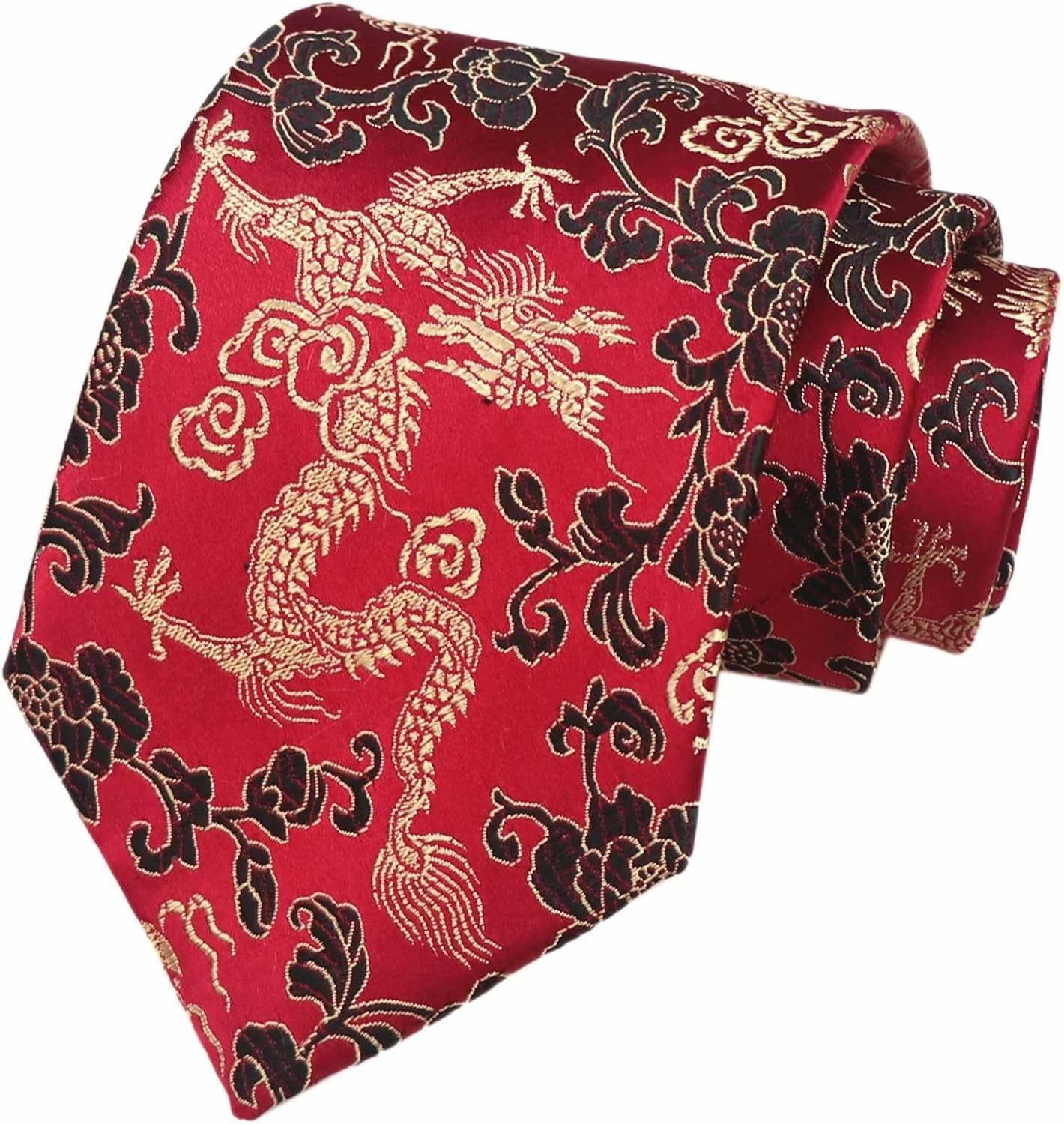 Men's Silk Tie Dragon Peony Embroidery Woven Wedding One Size Wine Red