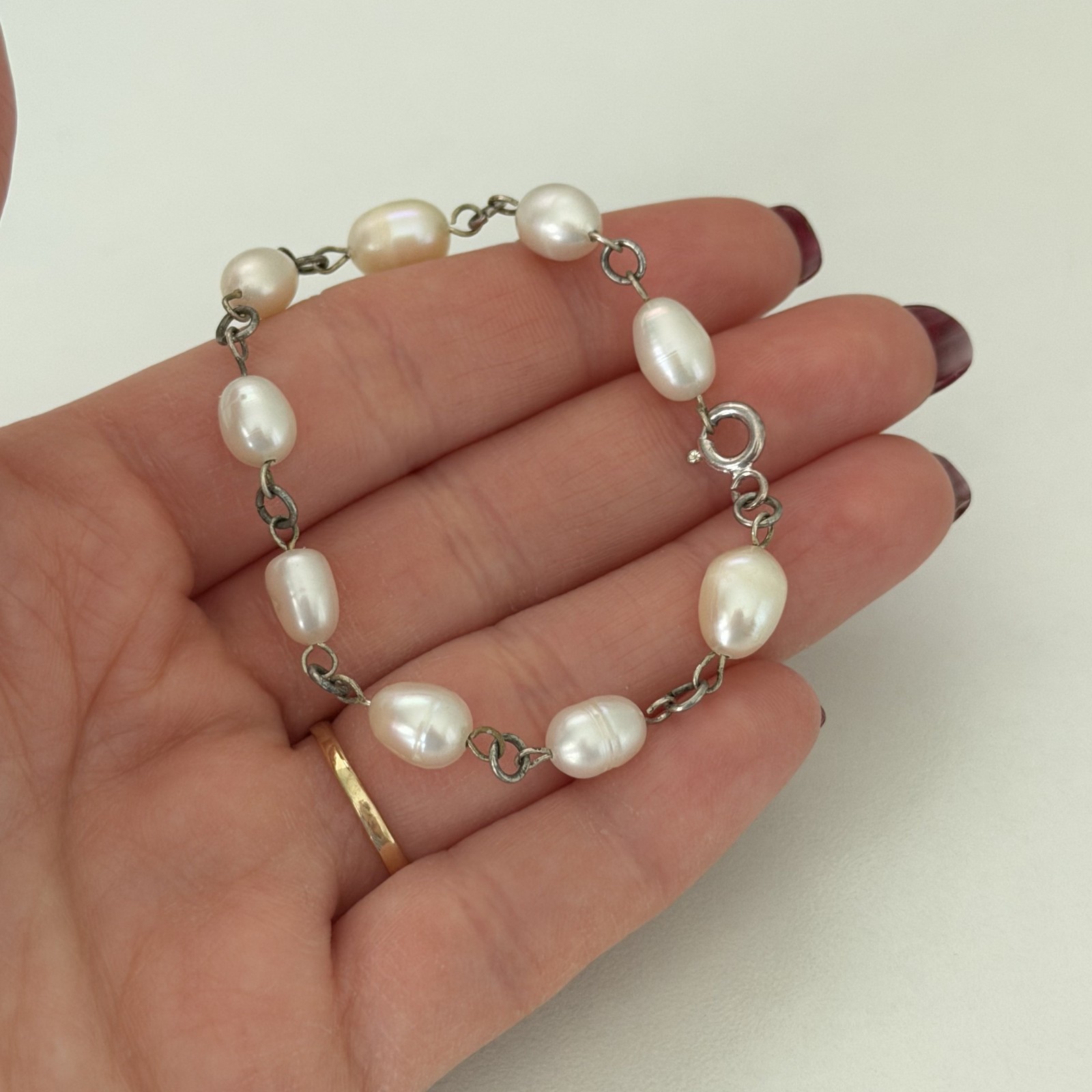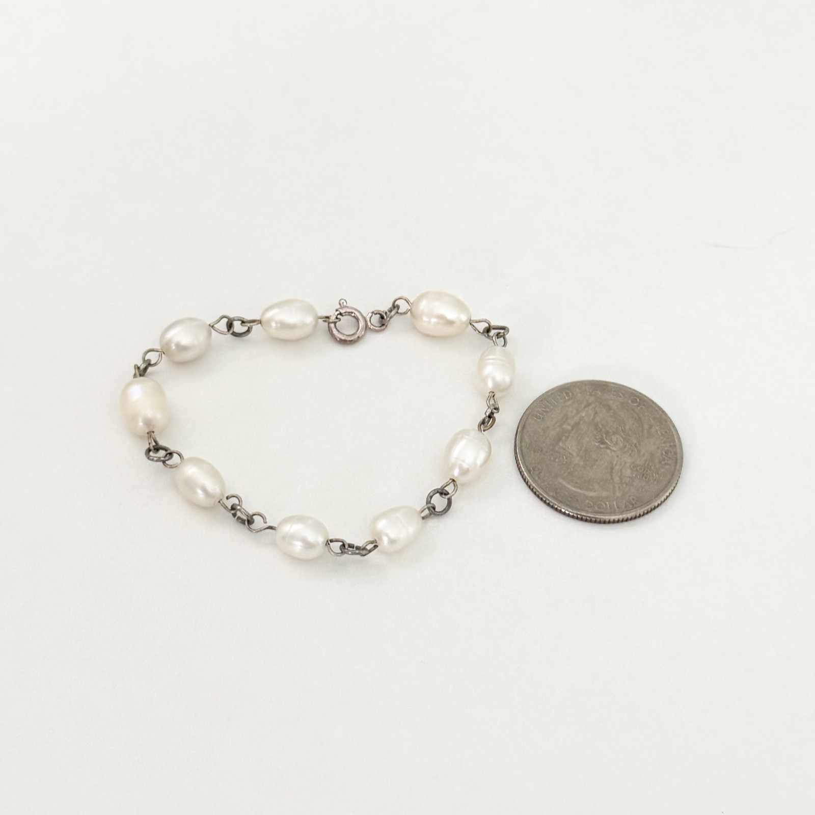 925 Sterling Silver Genuine Pearl Vintage Station Child Kid Sized Bracelet 6
