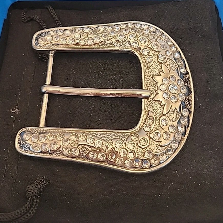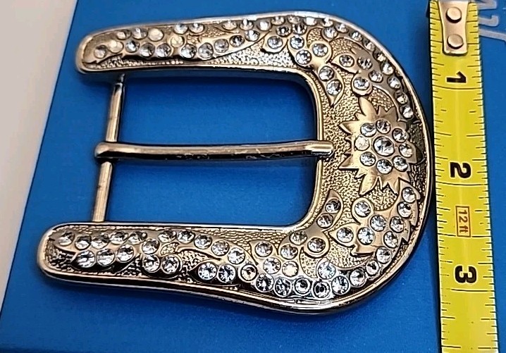 как выглядит Vintage Silvertone Belt Buckle with Rhinestones Etched Ornate Heavy 3.25" фото
