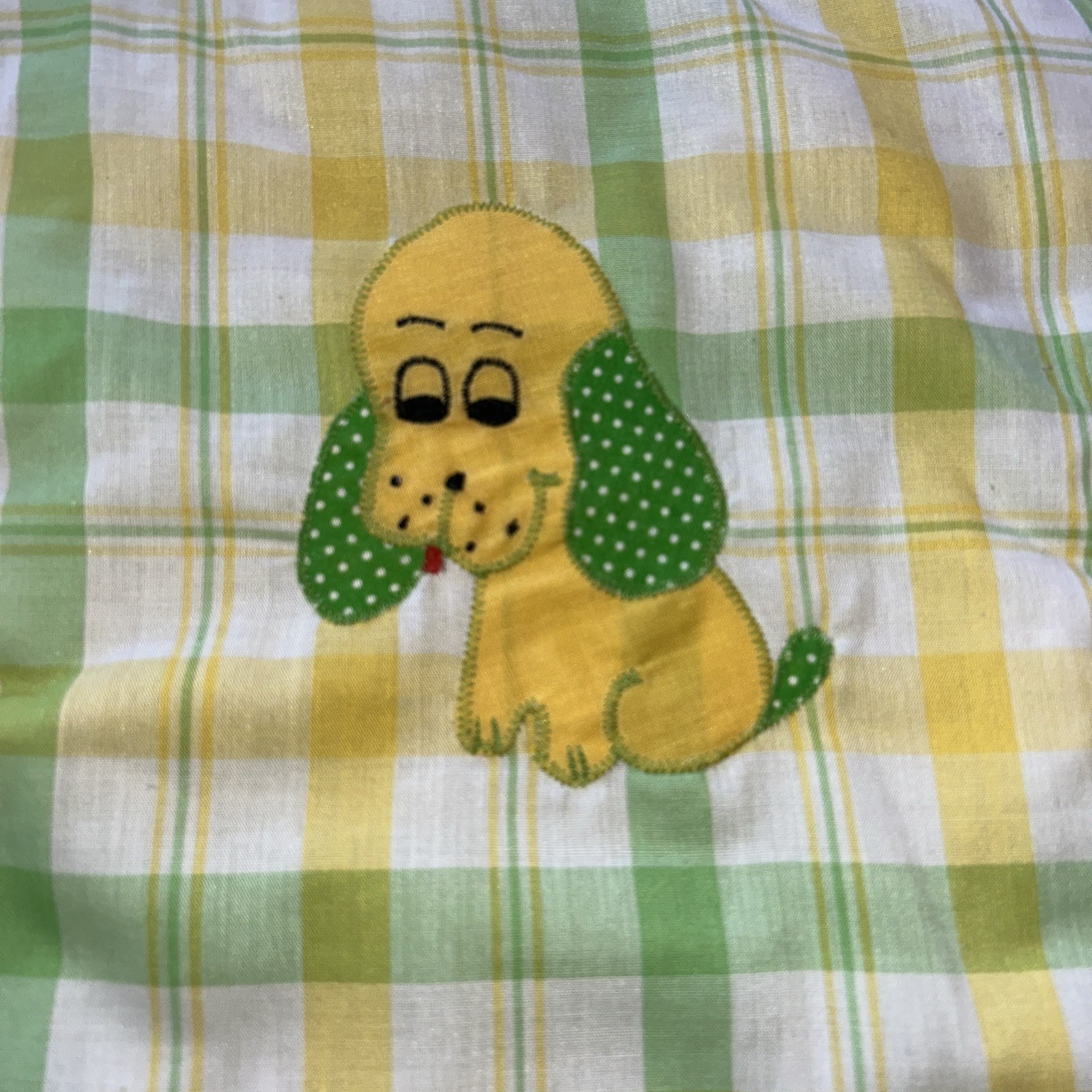 Vtg 60s Highchair Pad Seat Cushion Green Yellow Gingham Puppy Dog Floppy Ear