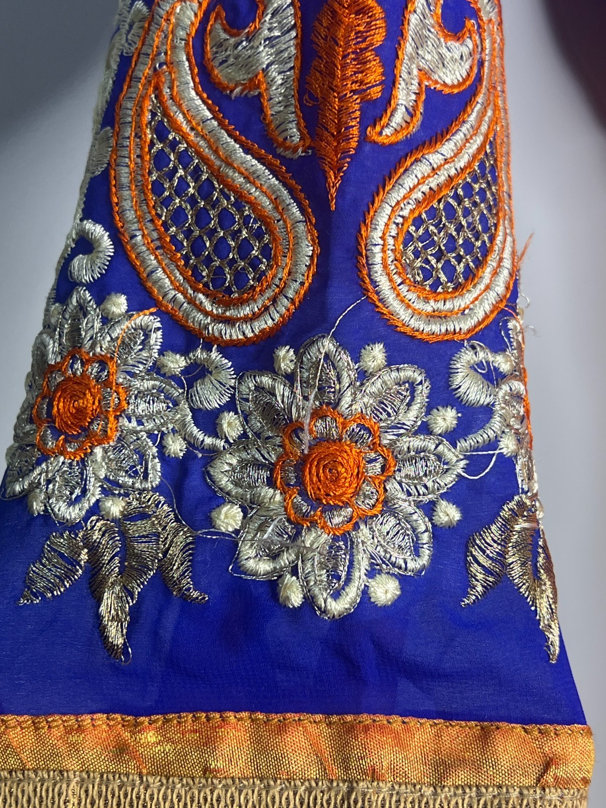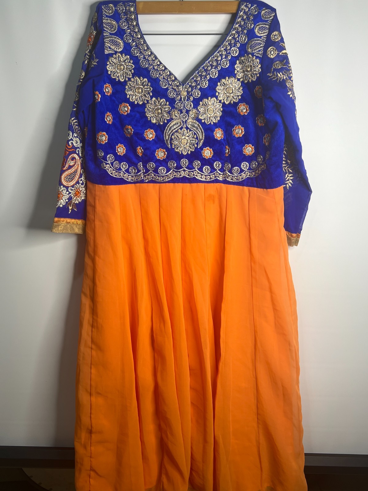 как выглядит Blue Orange Embroidered Indian Anarkali Dress  Heavy Work  Stained  Read фото