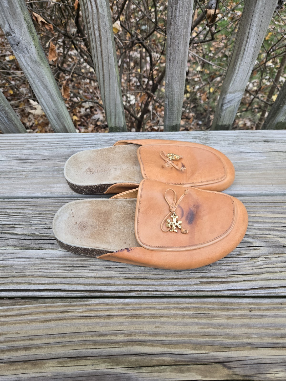 Tory Burch Charm Mules Flat Slip-on Brandy Genuine Leather Natural Cork Size 8