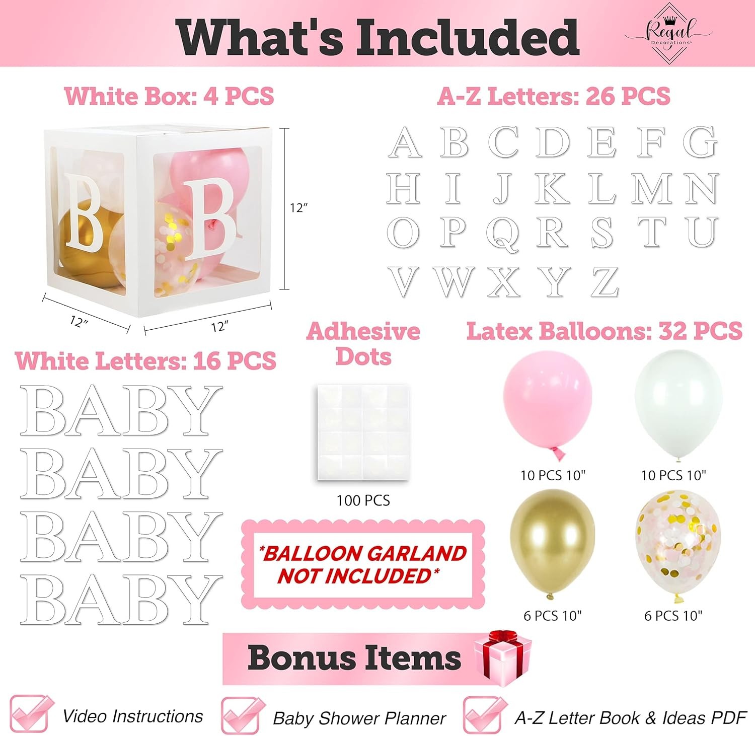 82PCS Baby Shower Decor for Girl Pink/Gold Boxes Letter Balloons