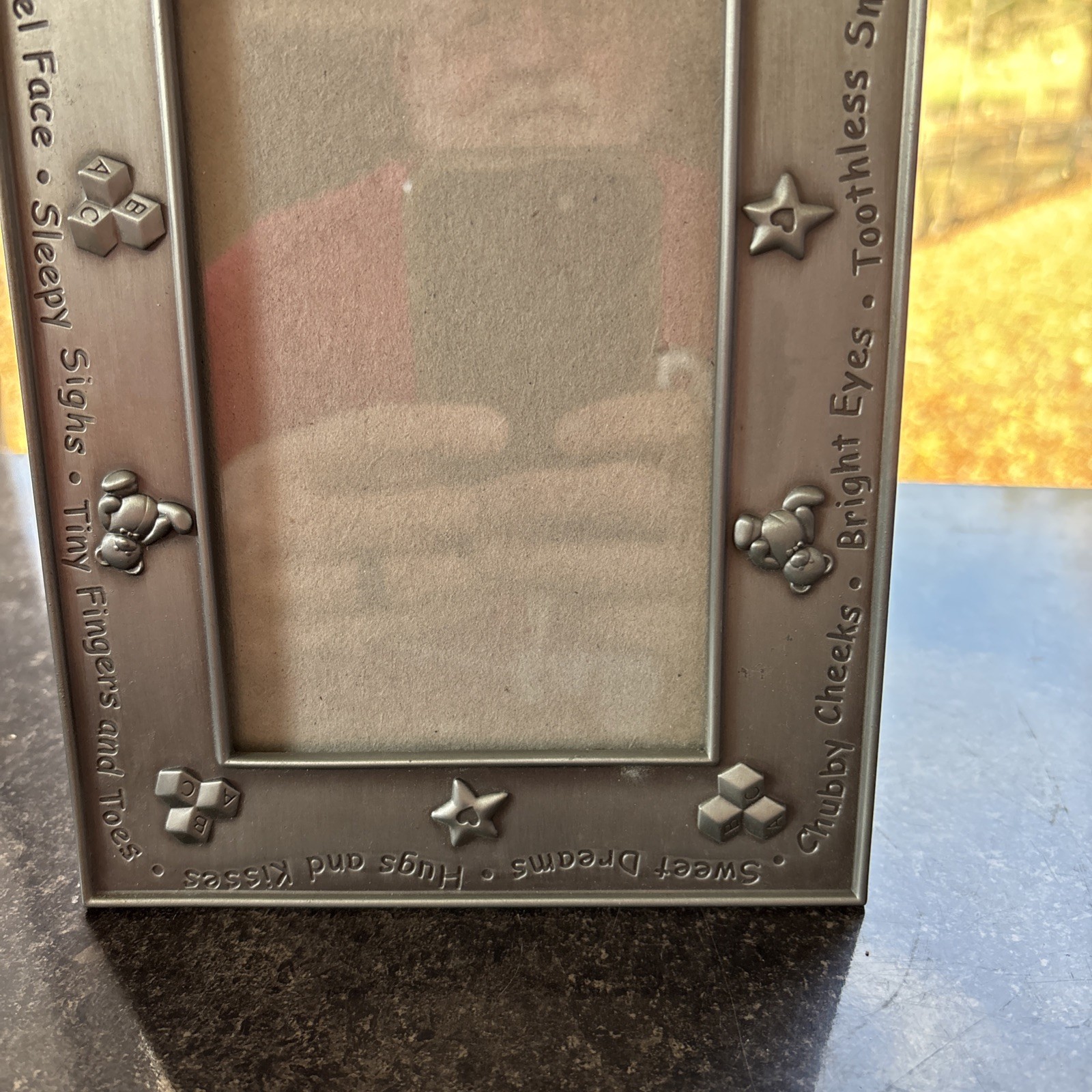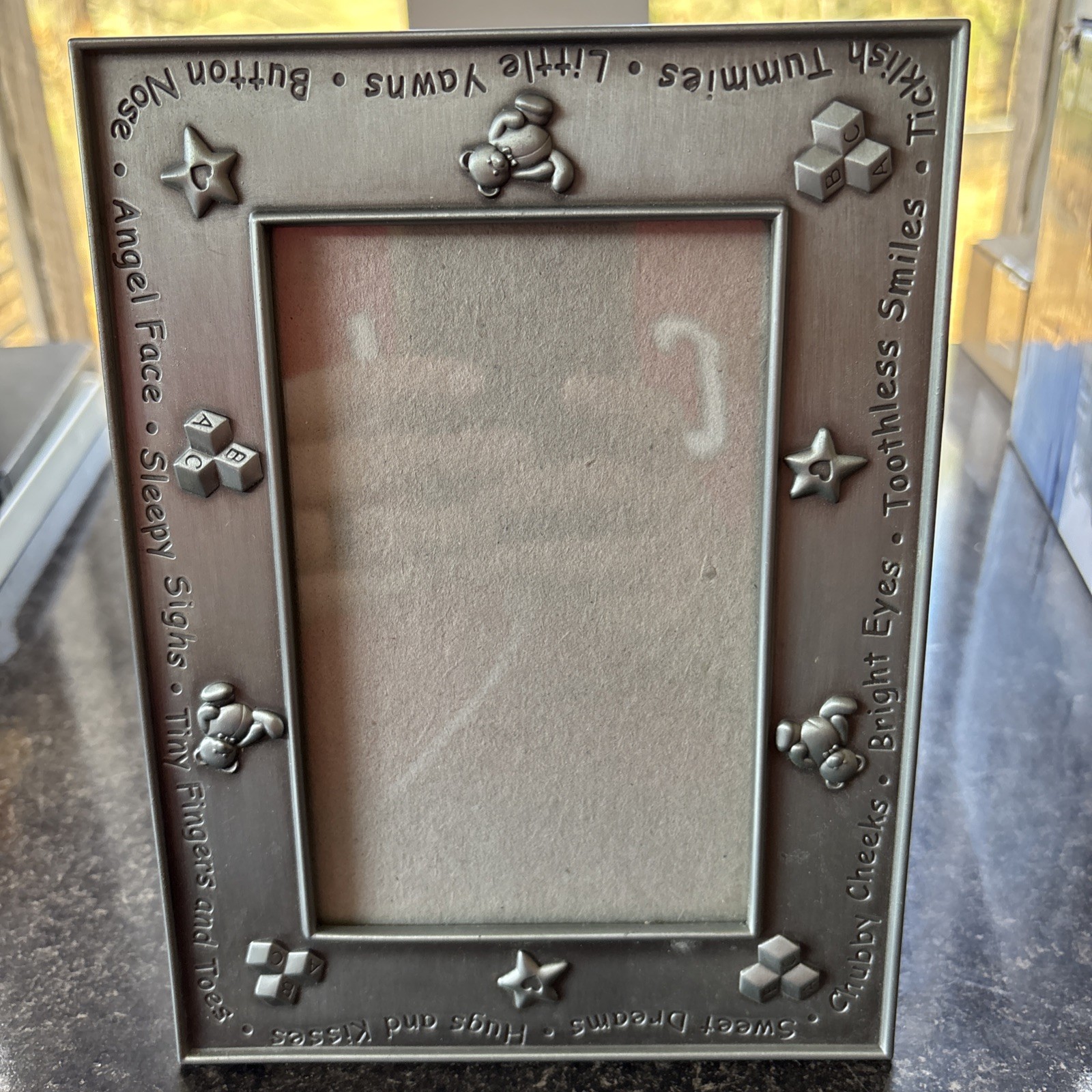 Pewter Baby Picture Frame, Raised Teddy Bear, Little Yawns, Toothless Smile Desi