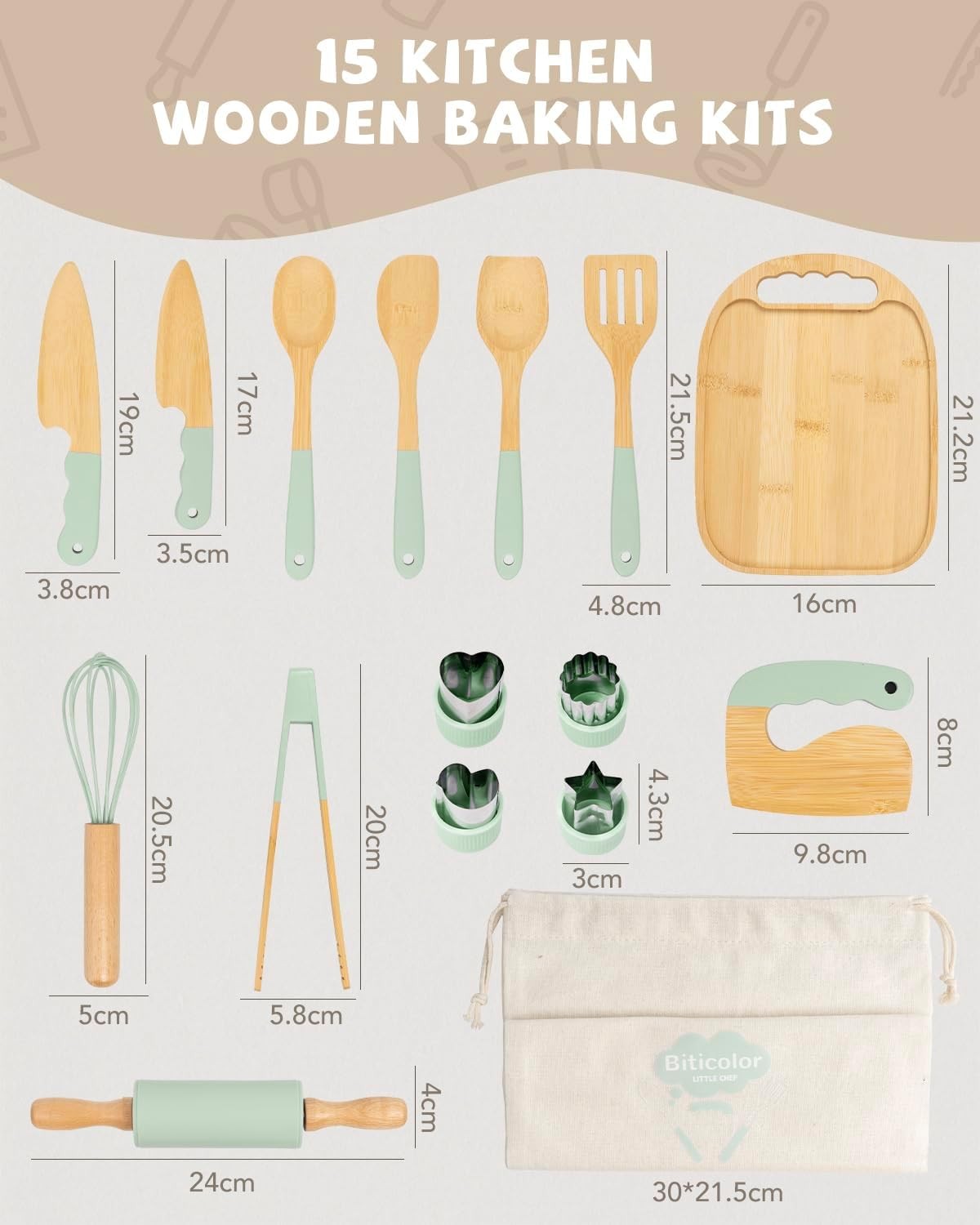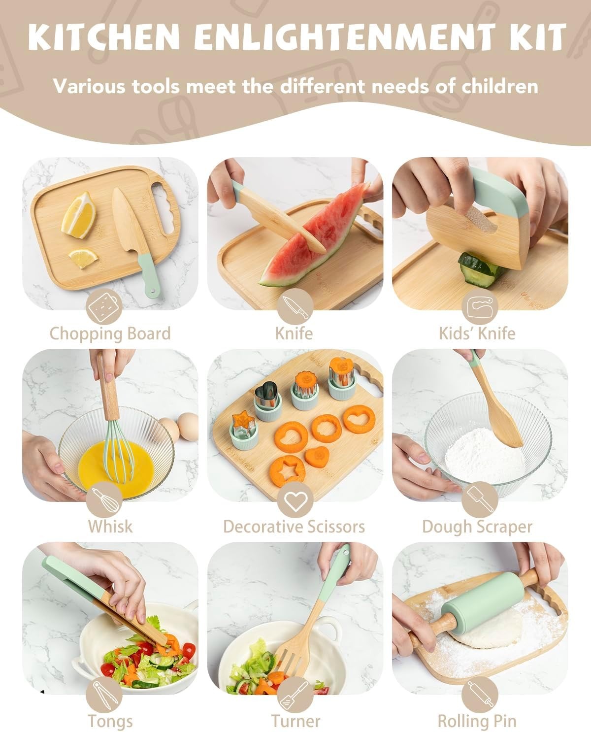 Wooden Kids Cooking Set Montessori Kit - Real Toddler Kitchen Tools Green