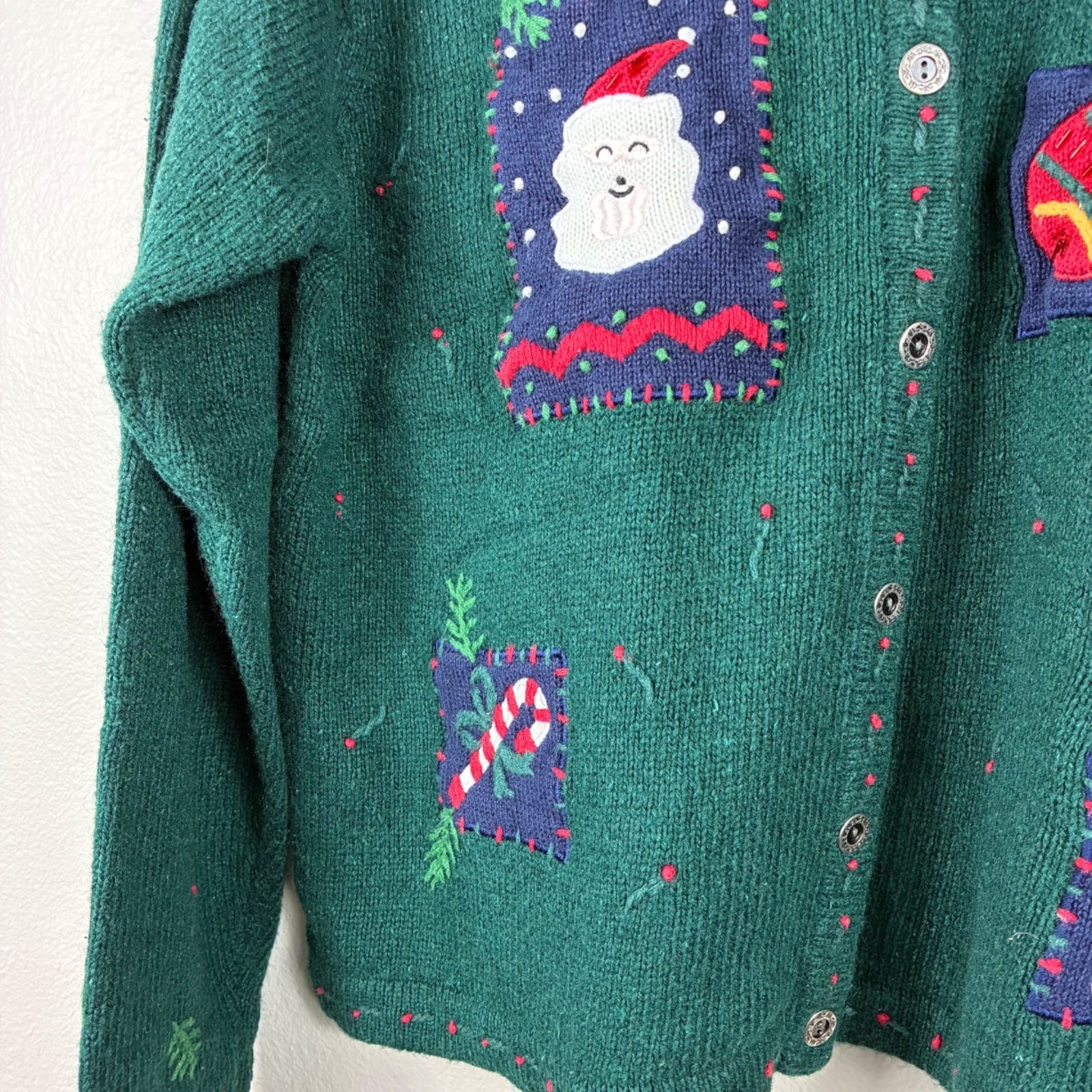 как выглядит VTG 80s Holiday Lodge by NorthCrest Christmas Patchwork Cardigan Green L Retro фото