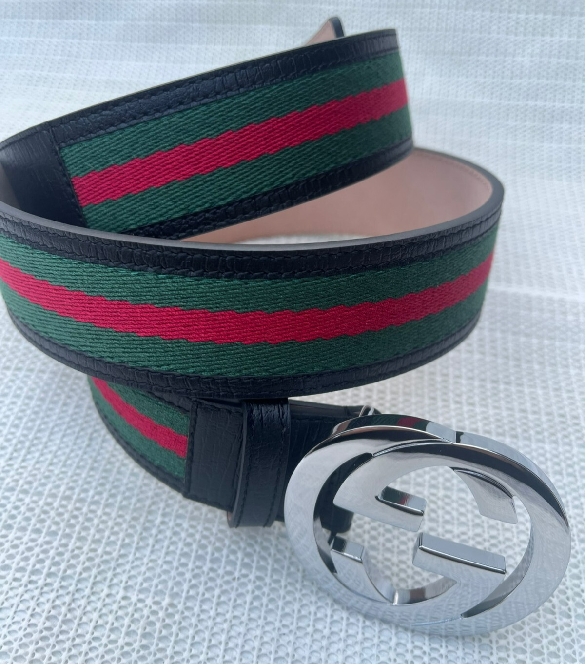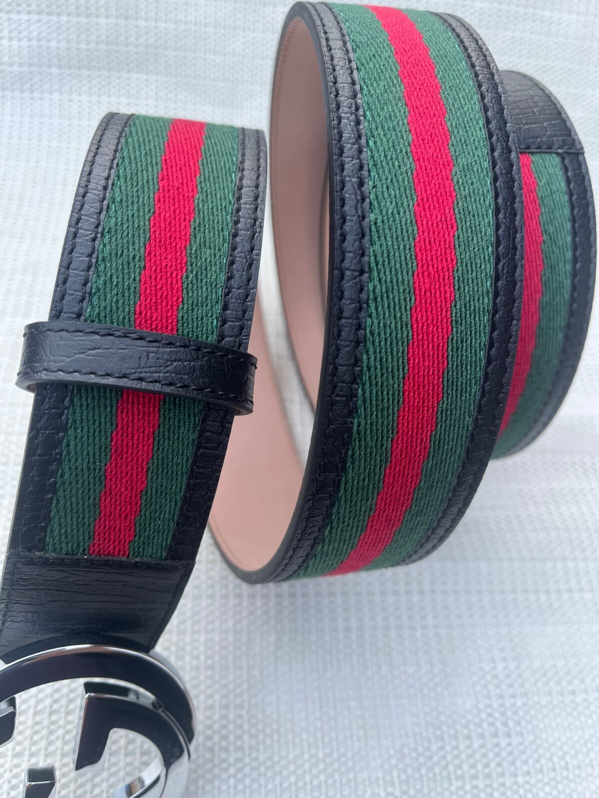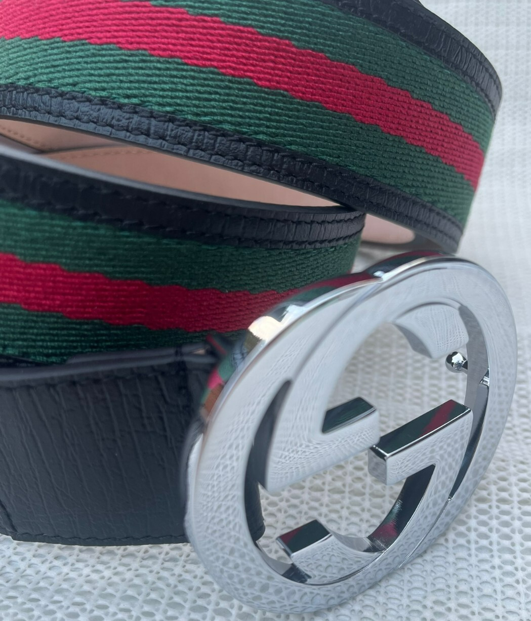 как выглядит Gucci GG Silver Interlocking Buckle Web Belt Black Green Red Size 115 cm 40/42 W фото