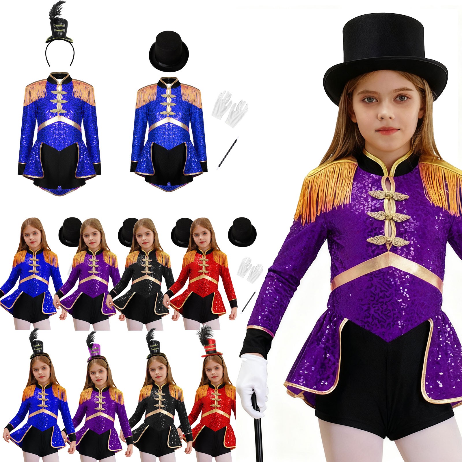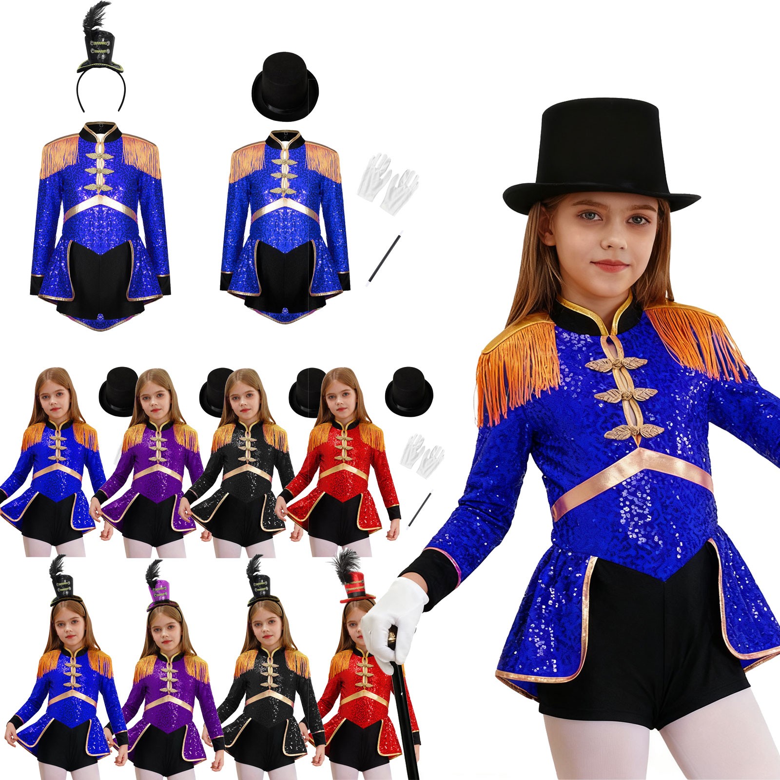 как выглядит Girls Circus Ringmaster Drummer Fancy Dress Costume Long Sleeve Sequins Jumpsuit фото