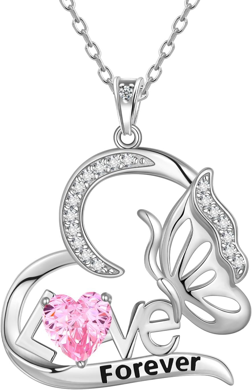 Birthstone Love Heart Butterfly Pendant Necklace - 925 Sterling Silver Firework-