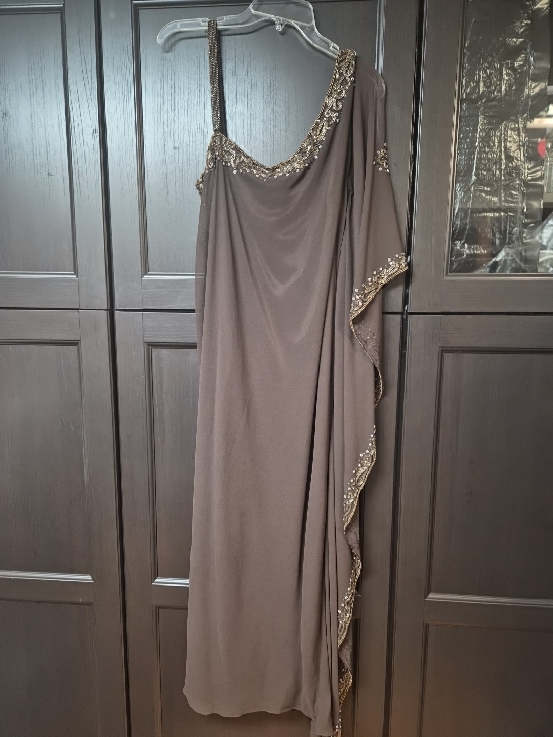 как выглядит Kjara Brown Sequence Kaftan Sz 14 W/One Sided Drape Mob Or Party Dress фото