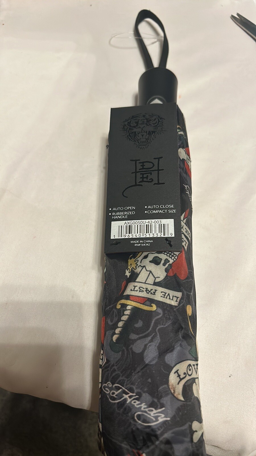 Ed Hardy Auto Open Compact Umbrella Love Kills Slowly Black Skull Snake Rose NWT