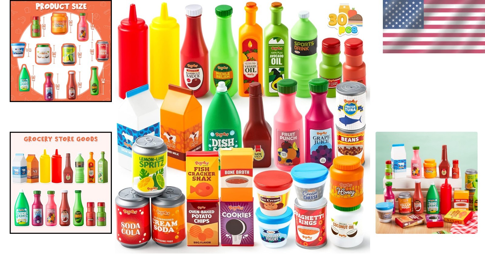 Особенности: Electrical, 30 pieces, grocery canned goods, includes drink, juice, seasoning, water bottle, sauce, yogurt, ice cream, broth, jar, snack box, easy to use, pop on and off can lids, simulation, role playing, promotes fun, ideal for birthday gifts, classroom activities, classroom prizes, non-toxic, non-BPA, meets US toy standards