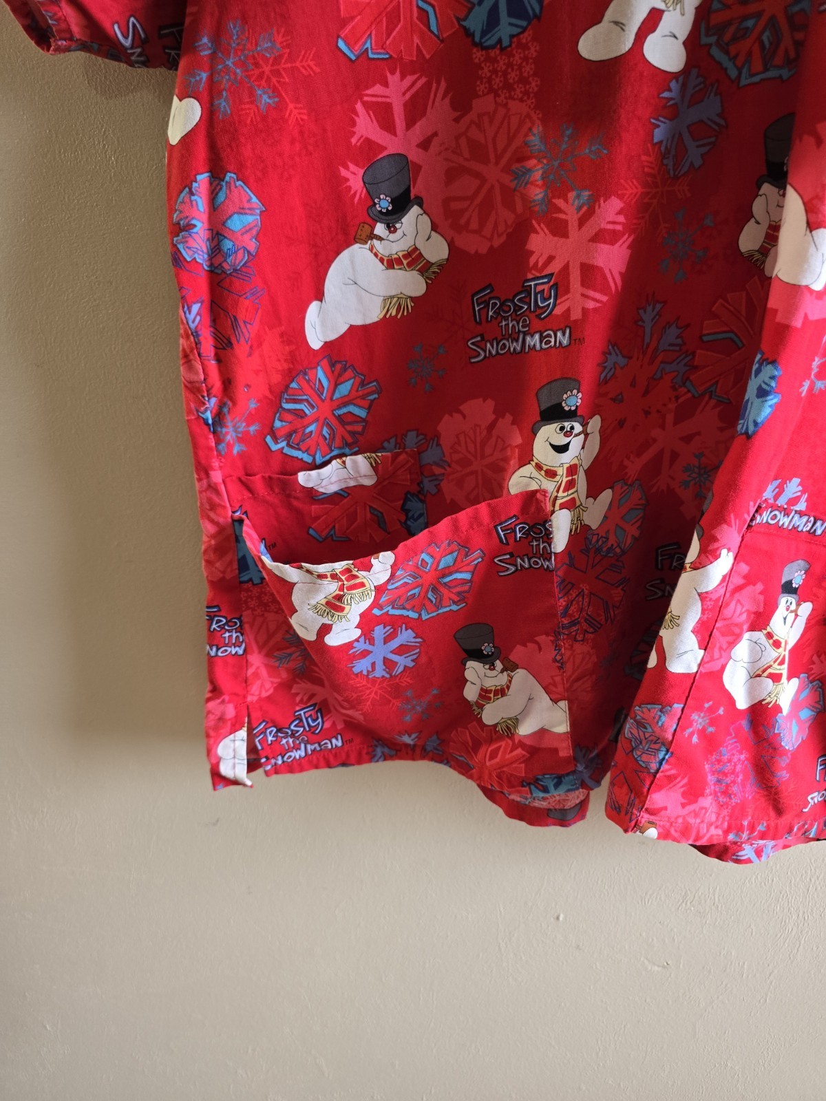как выглядит Womens Frosty The Snowman Red Multicolor Snowman V-Neck Pockets Scrub Top Sz L фото