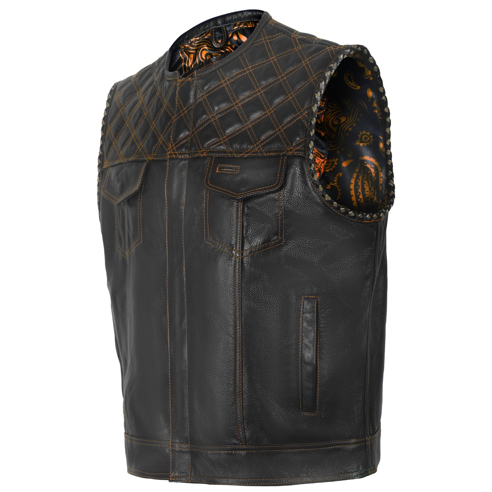 Men Black Leather Motorcycle Vest Brown Paisley Inner Bike Rider Waistcoat