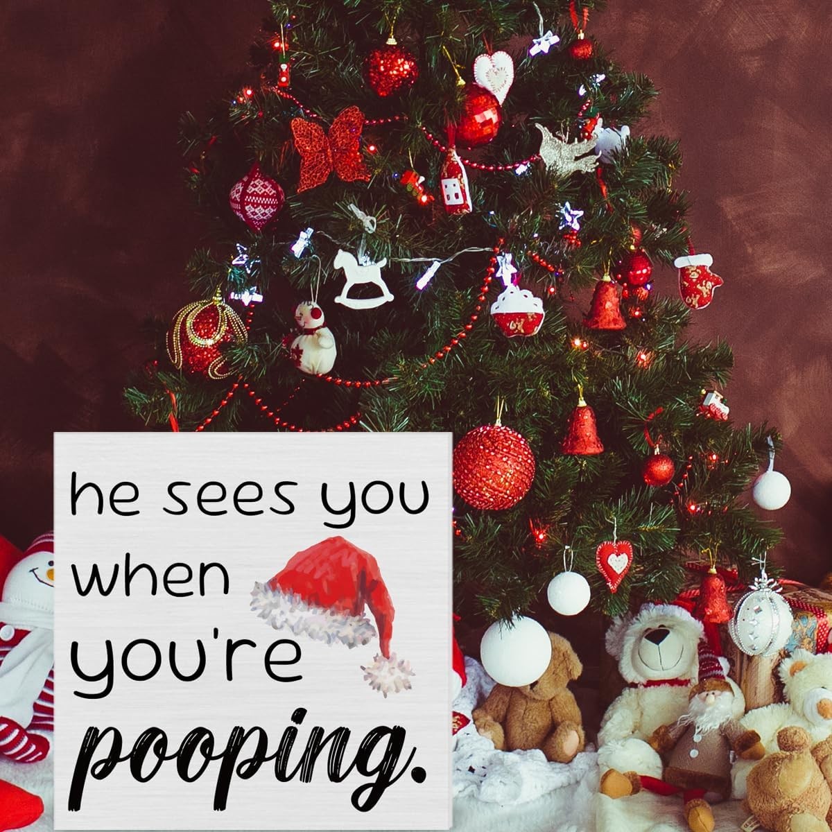 Funny Christmas Decor Wooden Sign He Sees You When You're Pooping 5x5