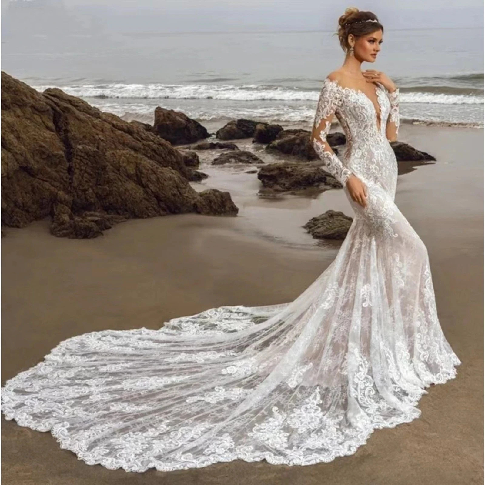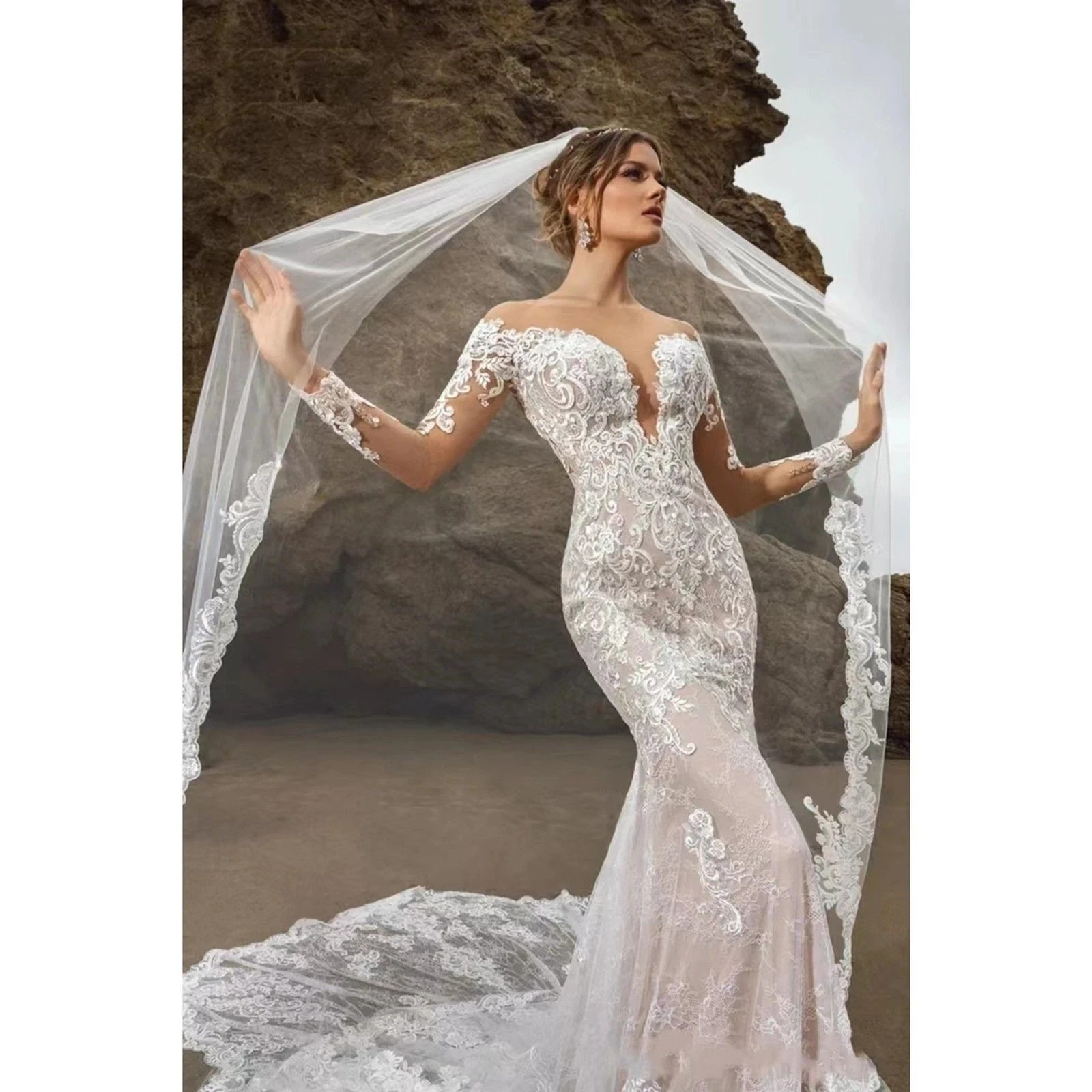 как выглядит IS-NWT US6 Deep V Wedding Dresses Long Mermaid Long Sleeve Lace Train Appliques фото