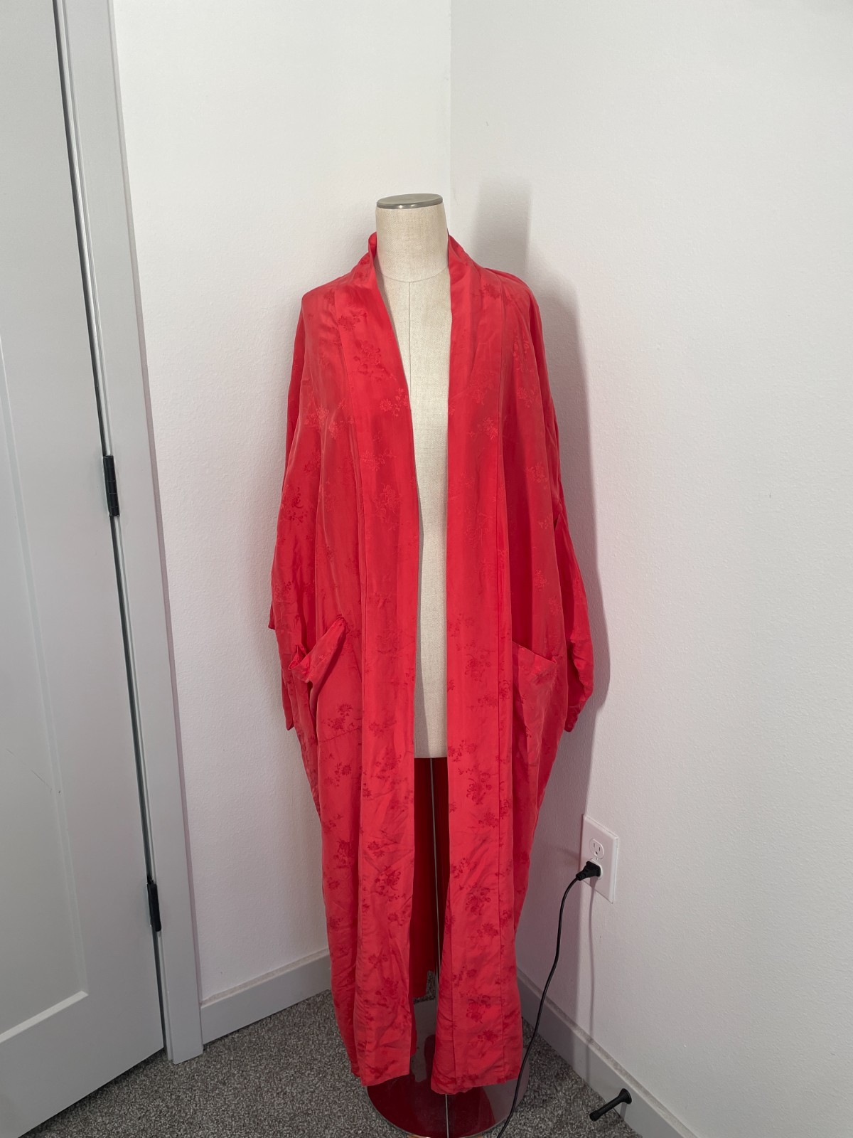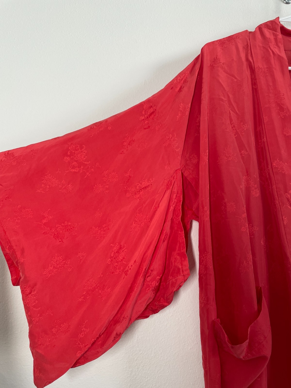 как выглядит Vintage Jade Silk Kimono Maxi Red Floral Traditional Jacket Robe фото