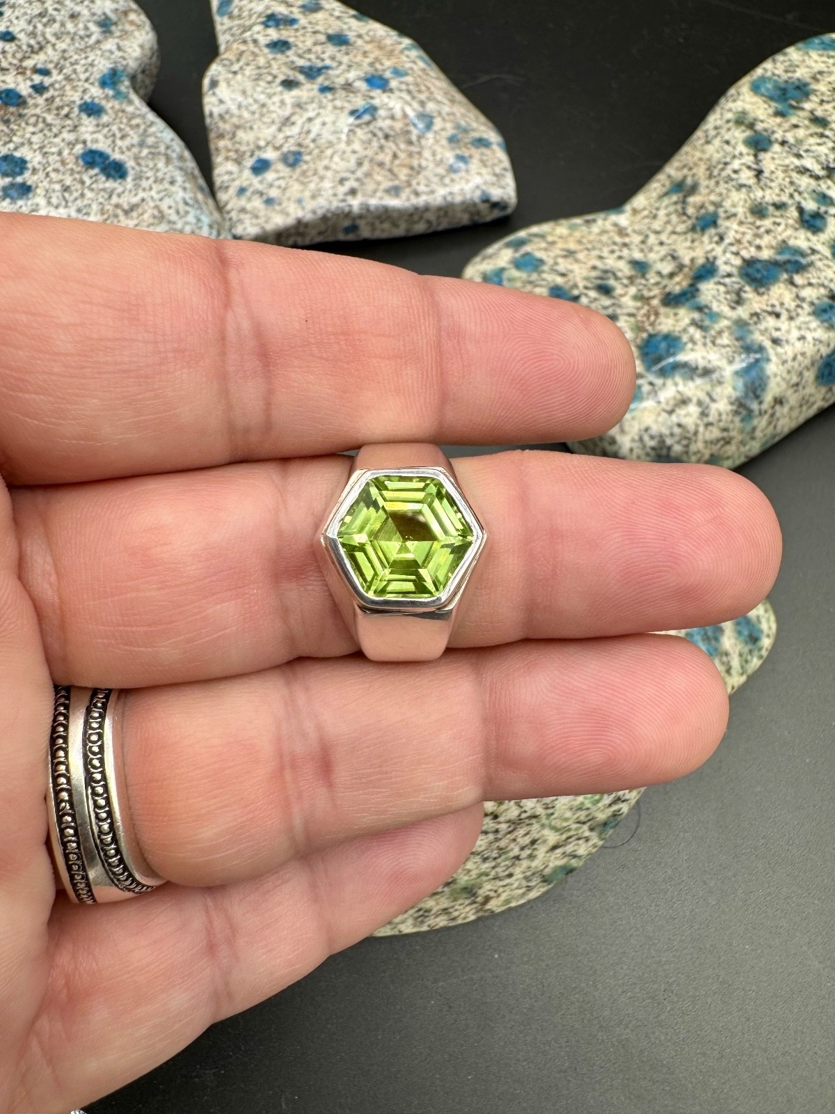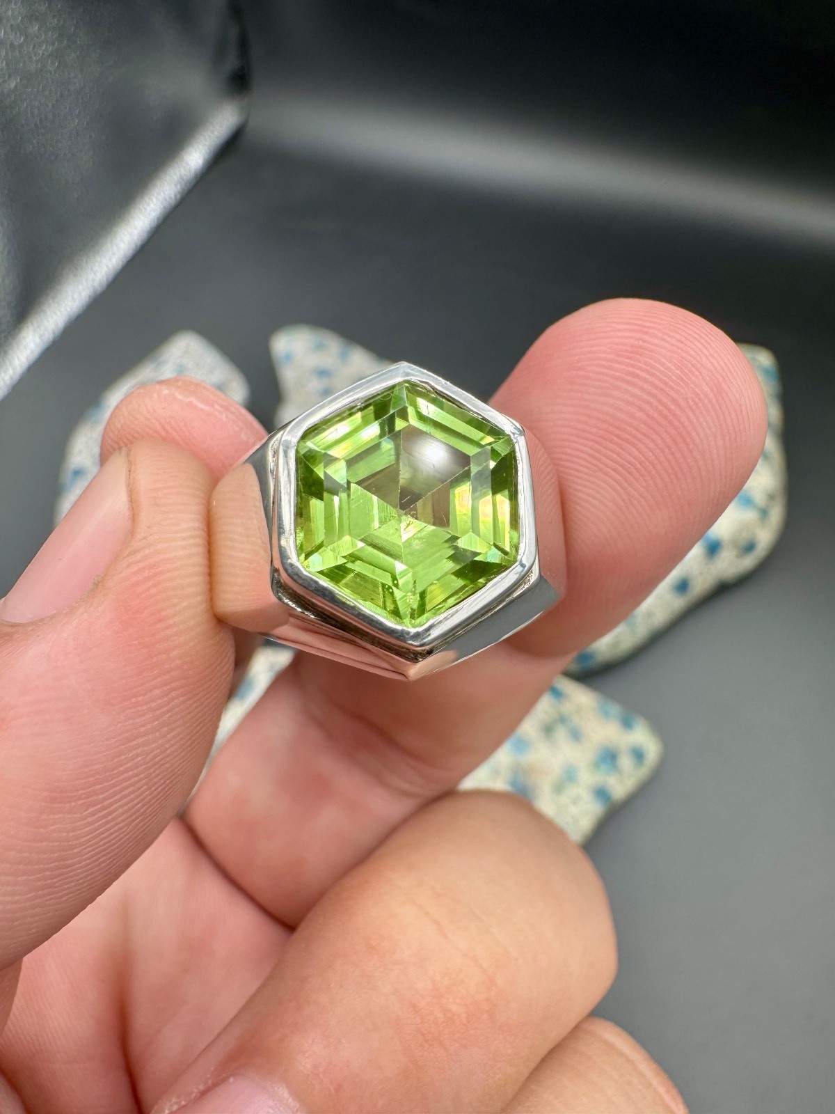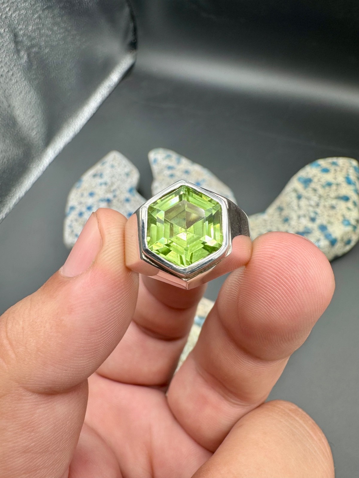 Size 10.3 AAA Grade Hexagonal Mint Green Peridot Handmade Silver Ring for Men