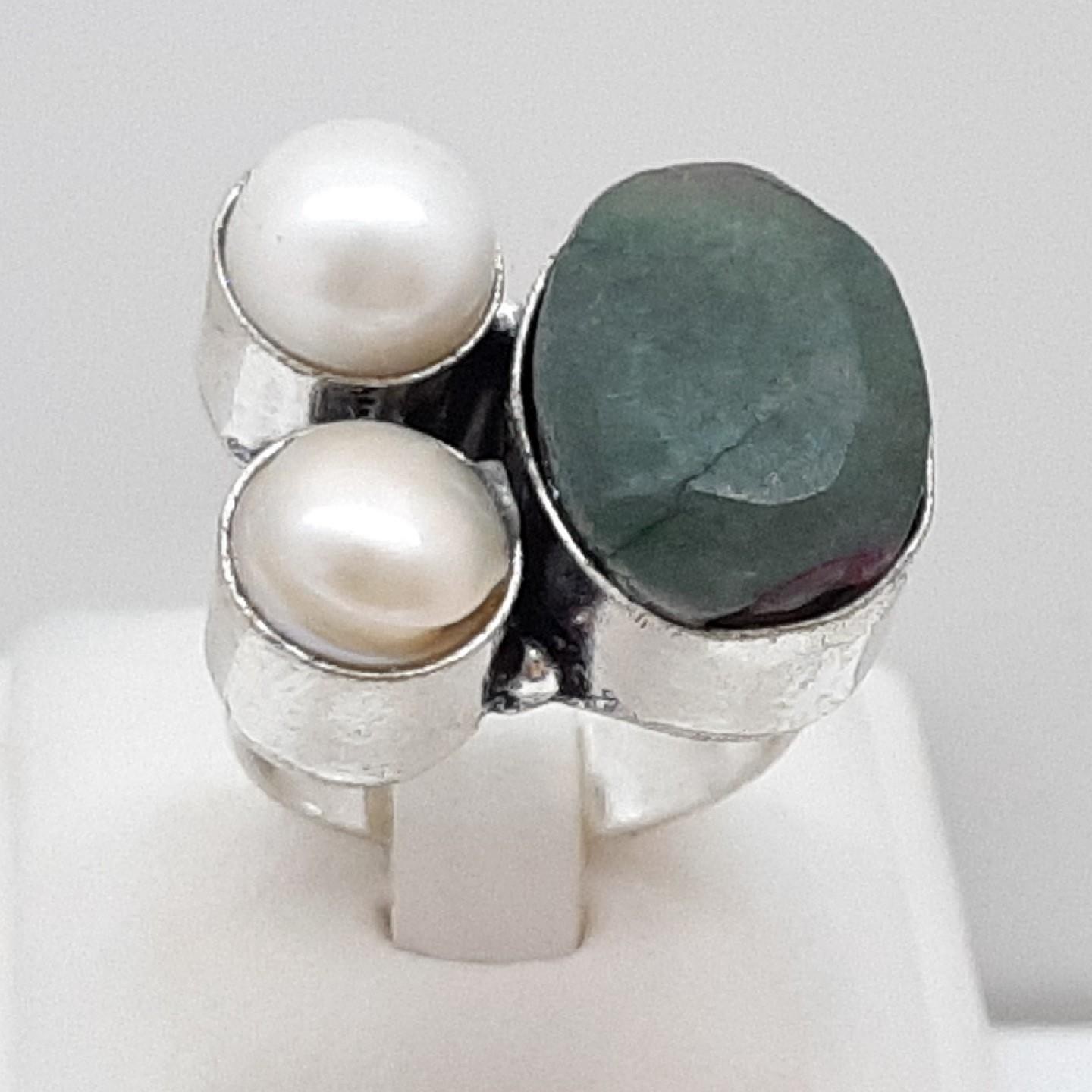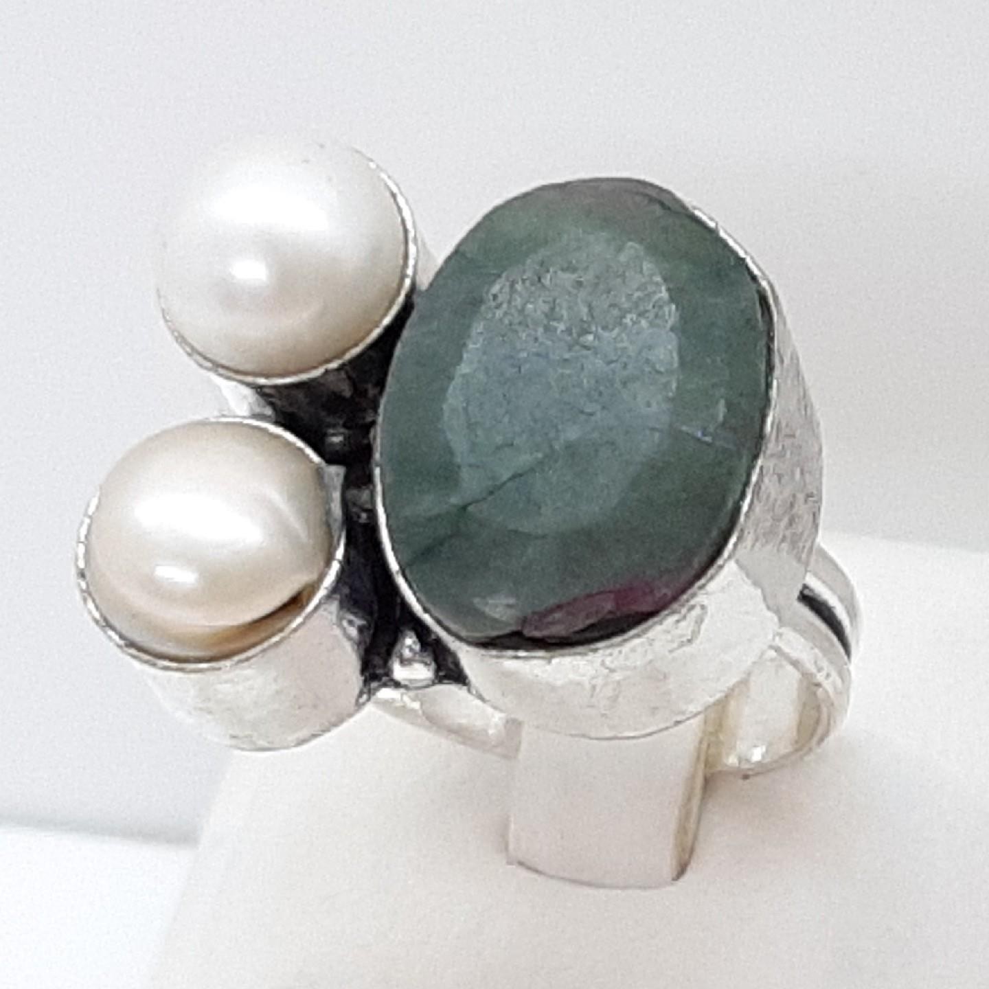 как выглядит Vintage 12.32ctw Green Sapphire Pearl Silver Ring Size 8 фото