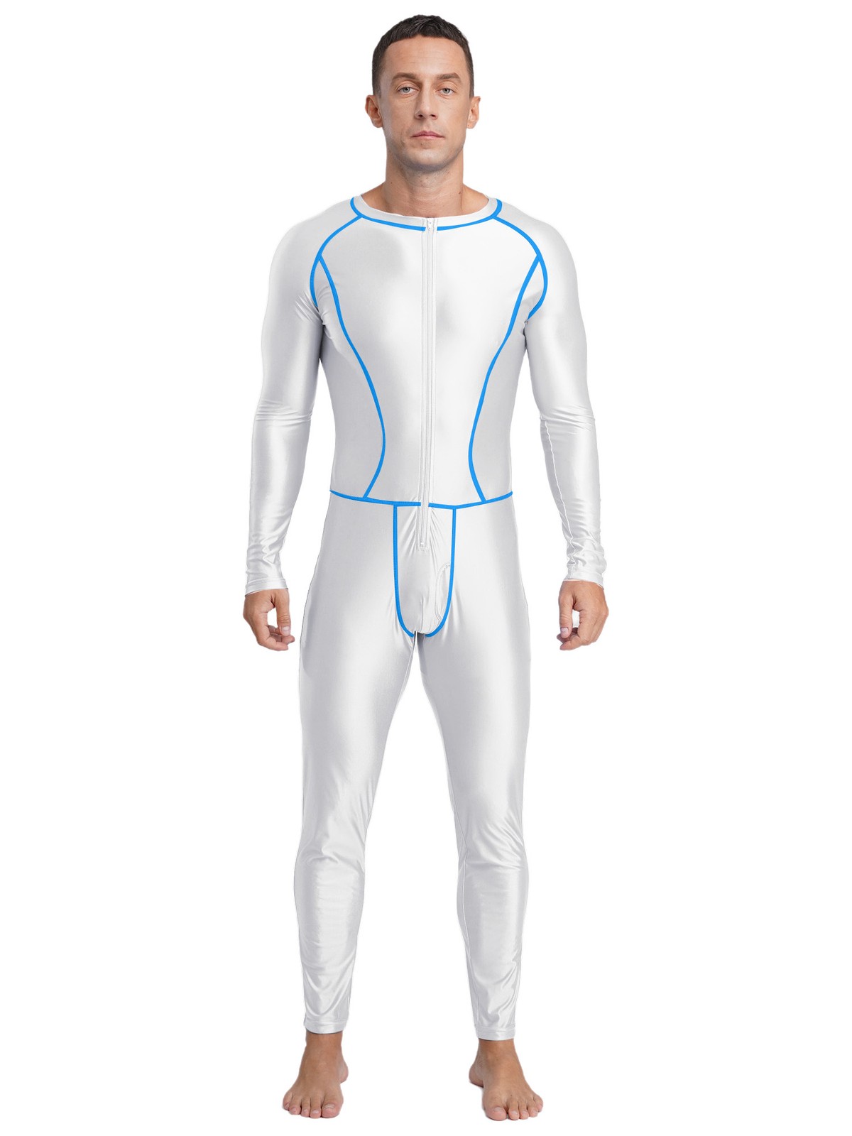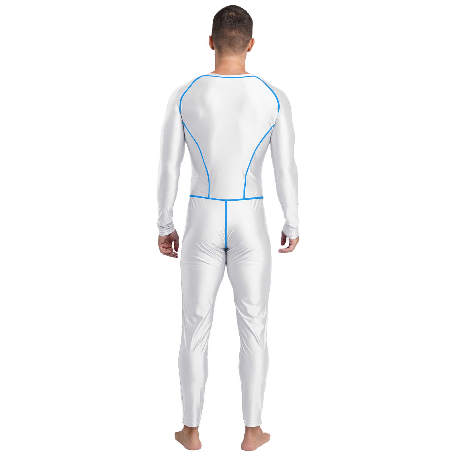 US Men's Glossy Slim Jumpsuit Flat Seams Front Zip Pants Compression Bodysuit