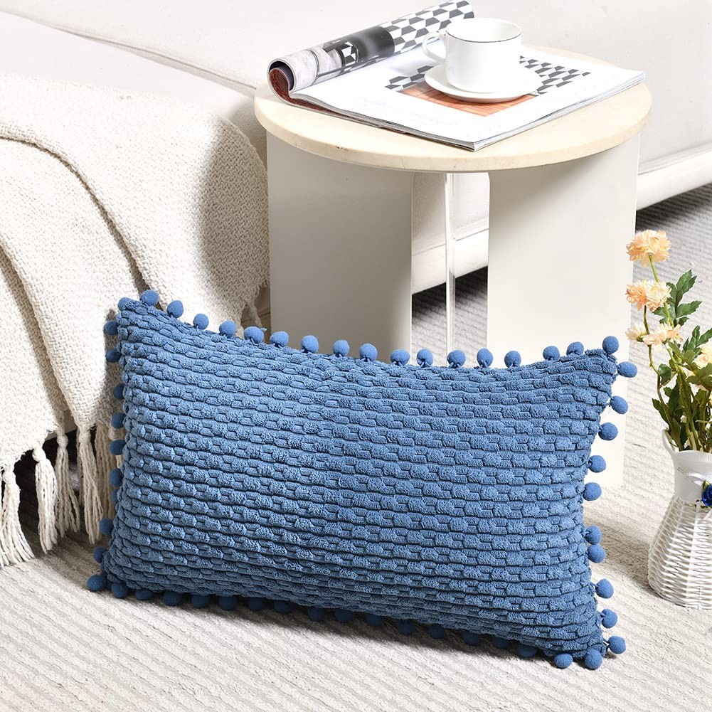 Set of 2 Dusty Blue Lumbar Decorative Throw Pillow Covers 12x20 Inch with Pom...