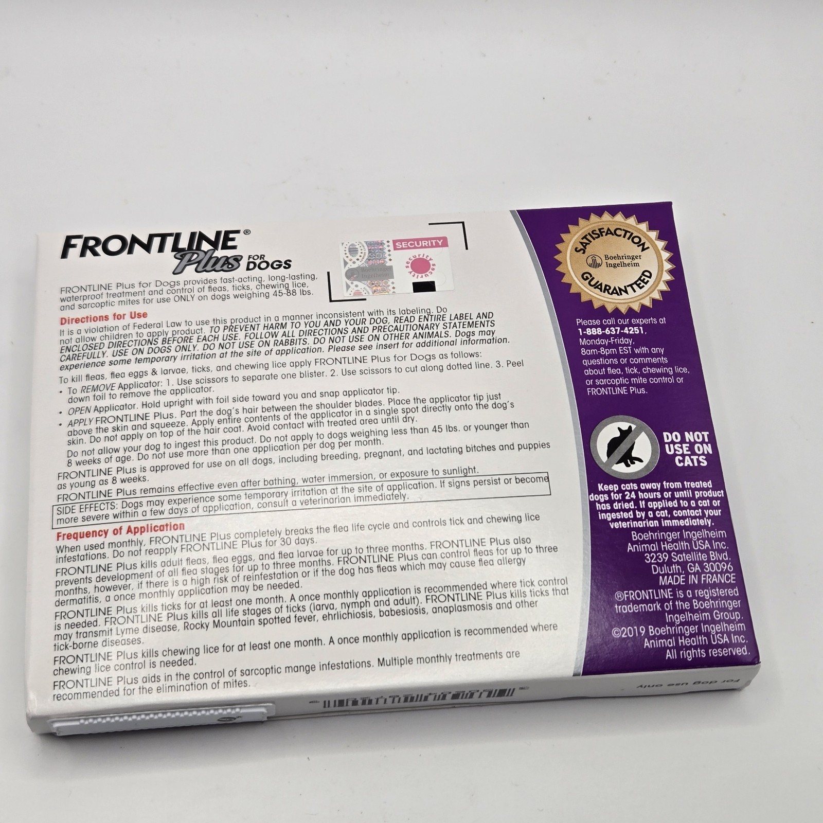 FRONTLINE PLUS for dogs 45 to 88 LBS. 100 Genuine Epa. Approved 3 doses