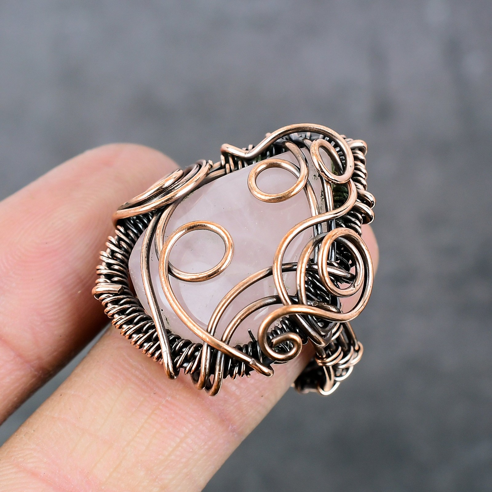 Rose Quartz Gemstone Handmade Copper Wire Wrap Jewelry Ring Size 9 o625