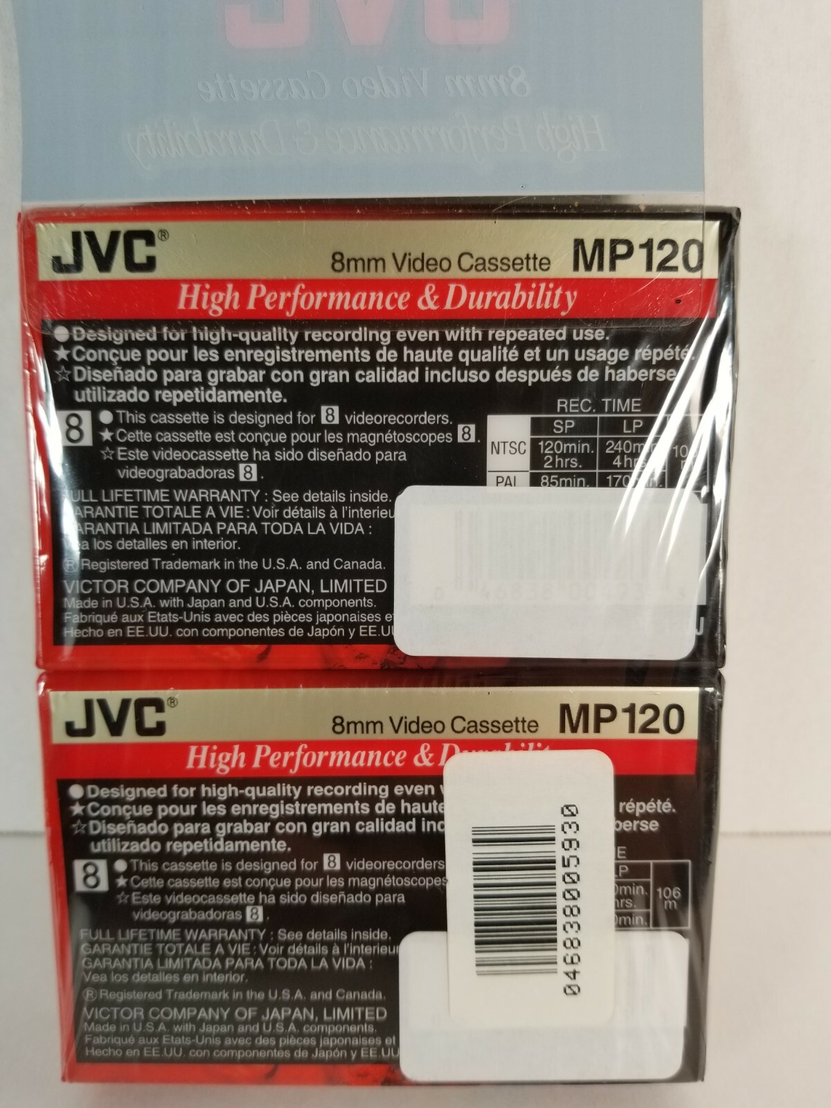 2 Two JVC 8 mm, 120mp Video Cassettes, Sealed.