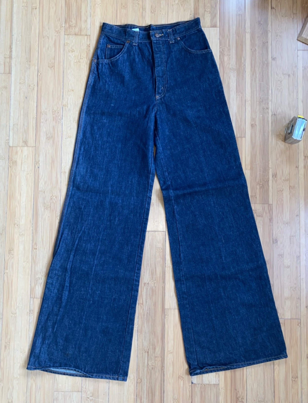 как выглядит 70s Souvenirs Pacific Blue Jeans High Rise Waist Bell Bottoms Buckle Back W 26.5 фото