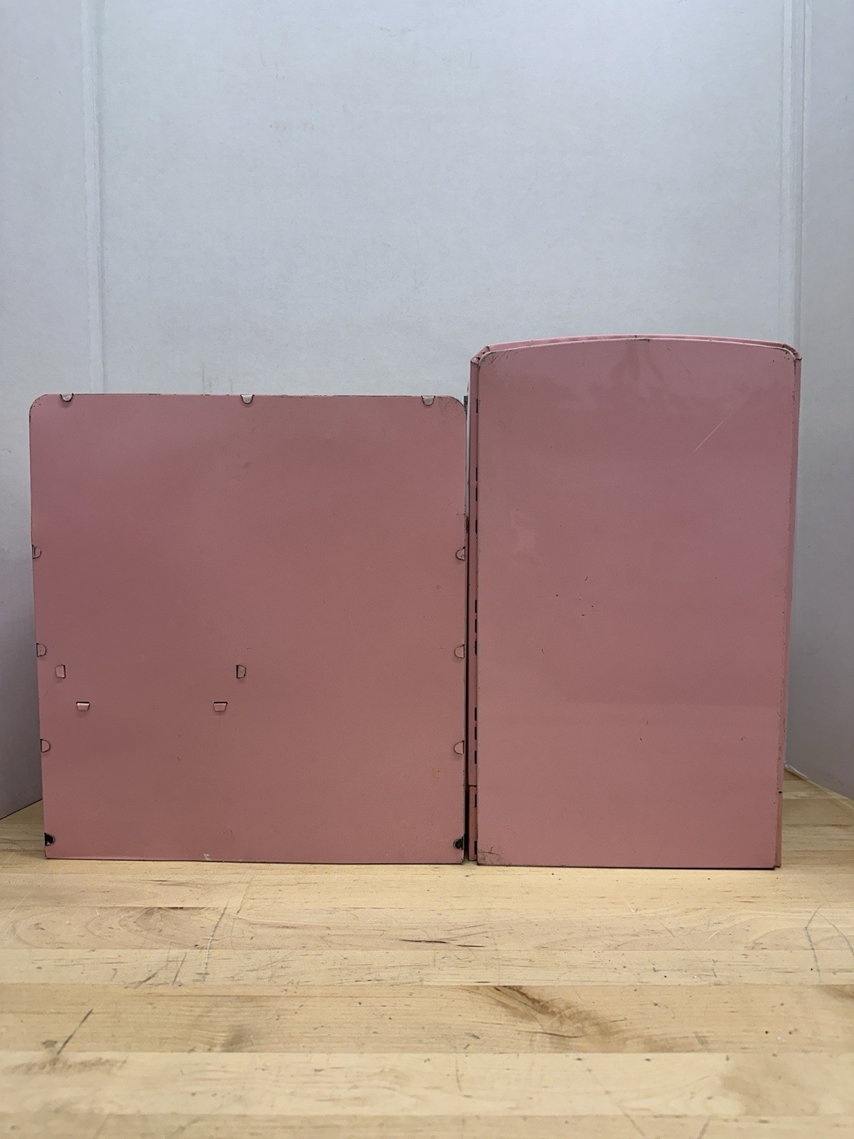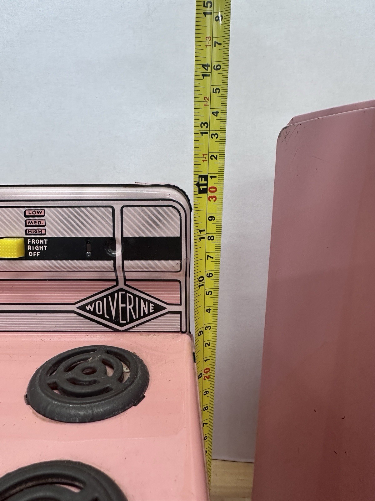 как выглядит Vtg Wolverine Pink Metal Tin Litho Toy Refrigerator Stove 1950s фото