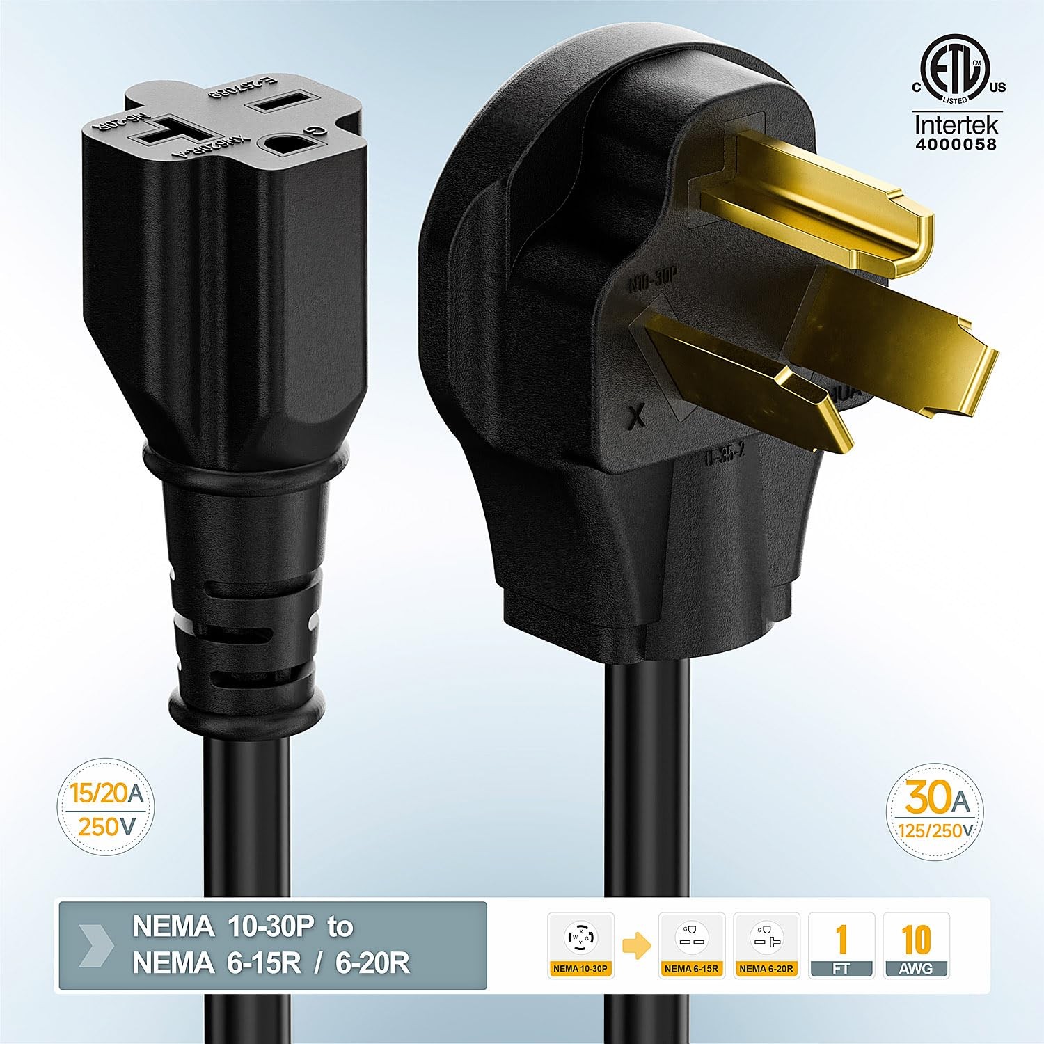 1FT Nema 10-30P 30Amp Dryer Plug Male to 6-20R T-Blade Female Adapter,30A 125